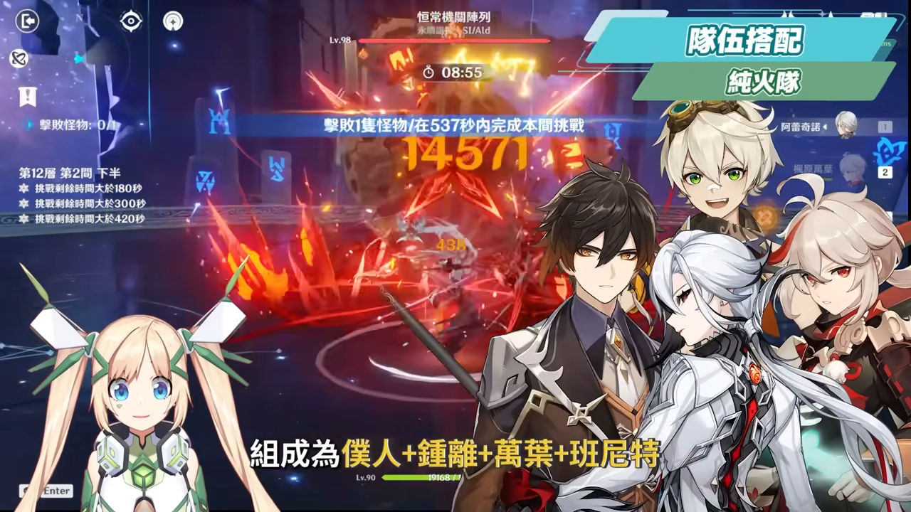 首先是純火隊的陣容,組成為僕人+鍾離+萬葉+班尼特,純火隊可以說是簡單無腦就有高傷害的的一個陣容,而且傷害數字也比較穩定,適合喜歡穩紮穩打的玩家,鍾離提供護盾減抗與保生存,萬葉提供增傷和減抗,班尼特雙火共鳴和加攻,若三個隊友真的要換一個可能會是萬葉,非2命僕人可以E先起手,接鍾離長E→萬葉EQ→班尼特QE→僕人重擊+普攻+Q+E,又或是僕人接在班尼特後面E重QE重+普攻。