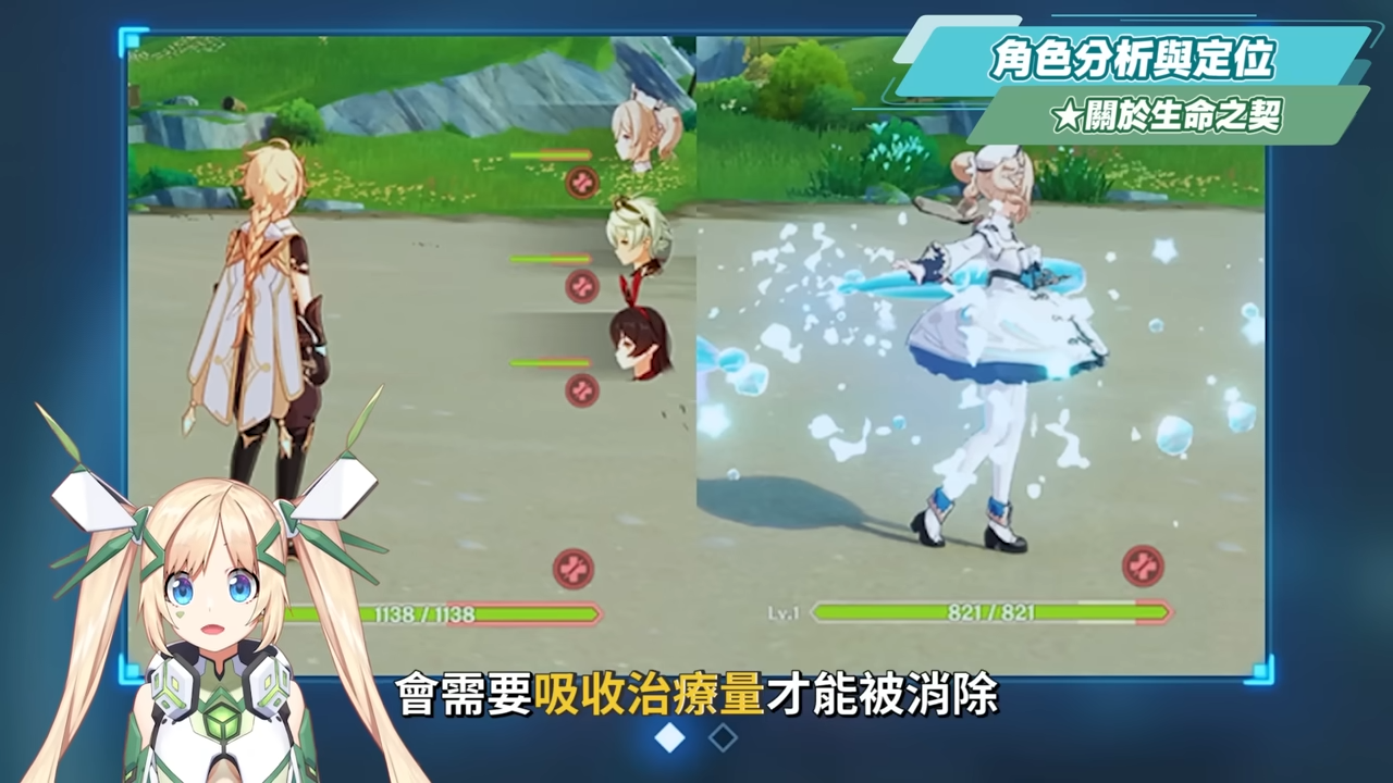 如果是不熟「生命之契」這項機制的新手們,洛洛這邊也再稍微幫各位複習一下,而如果想要體驗一下「生命之契」的機制的話,也可以自己使用像是海淵終曲、純水流華這類武器,或是去找風役人、霜役人打架,感受一下生命之契在沒被消除前、無法正常受到治療恢復血量的體驗。當角色獲得生命之契時,生命值血條上就會呈現一種被包覆的生命條,這條被包覆的紅血會需要吸收治療量才能被消除,如果在生命之契未被消除前,角色的生命值即便受到治療也無法恢復。