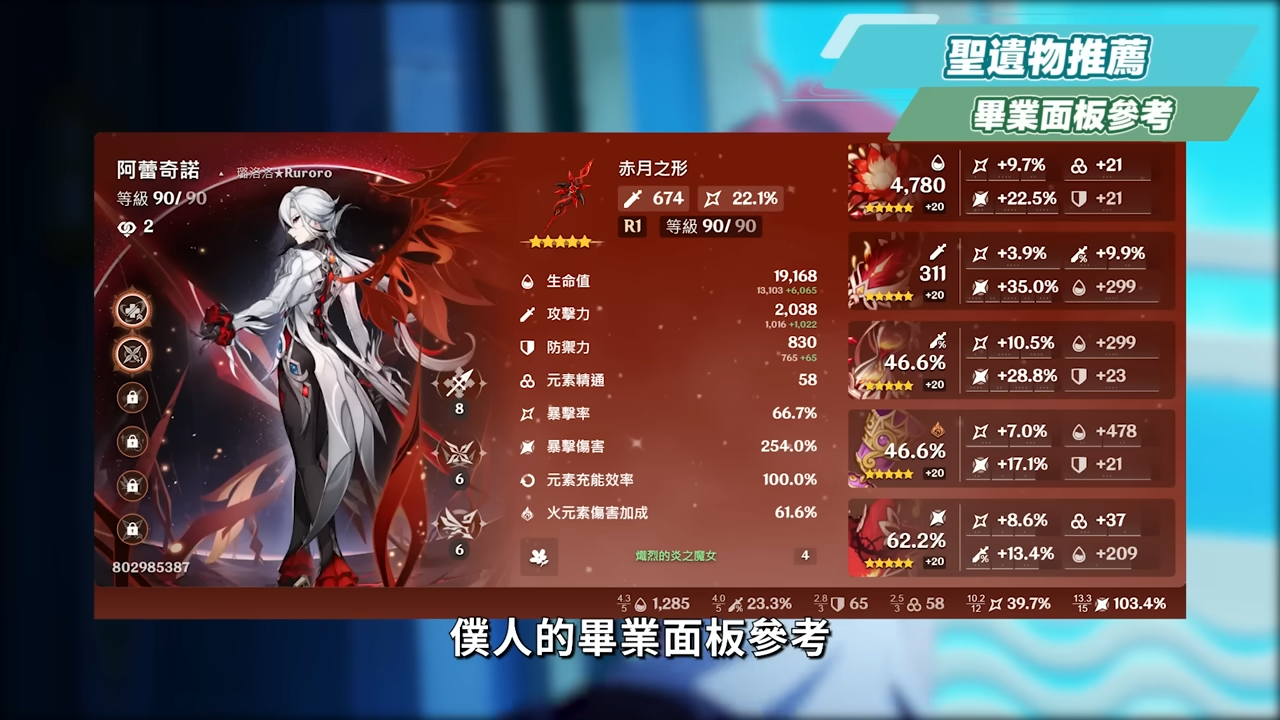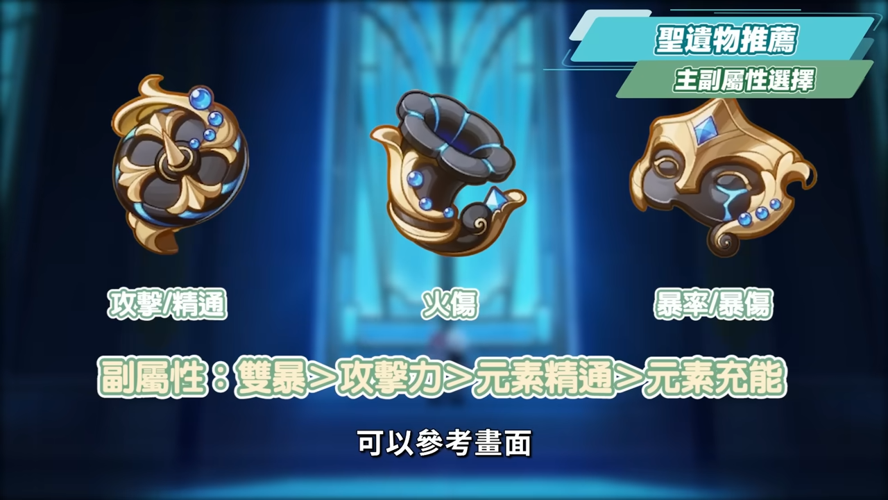 聖遺物主副屬性選擇可以參考畫面,禮之冠選擇雙暴,而空之杯選擇火傷杯,雖然觸發戰鬥還會+40%火傷,有火傷杯的情況下會來到100%左右的火傷加成,不過火傷大概也要到110%以上才會開始有明顯的稀釋,因此還是可以優先穿火傷杯,時之沙選擇攻擊力或元素精通,主要看你是什麼打法,直傷打法就可以選攻擊沙,而若是打蒸發可以搭配元素精通沙,但也要看你的武器,假如武器是元素精通主屬性的,時之沙就帶攻擊力的避免稀釋。而若是實戰會比較希望有終結技的循環,也可以從副屬性加減堆個15~20%的元素充能。