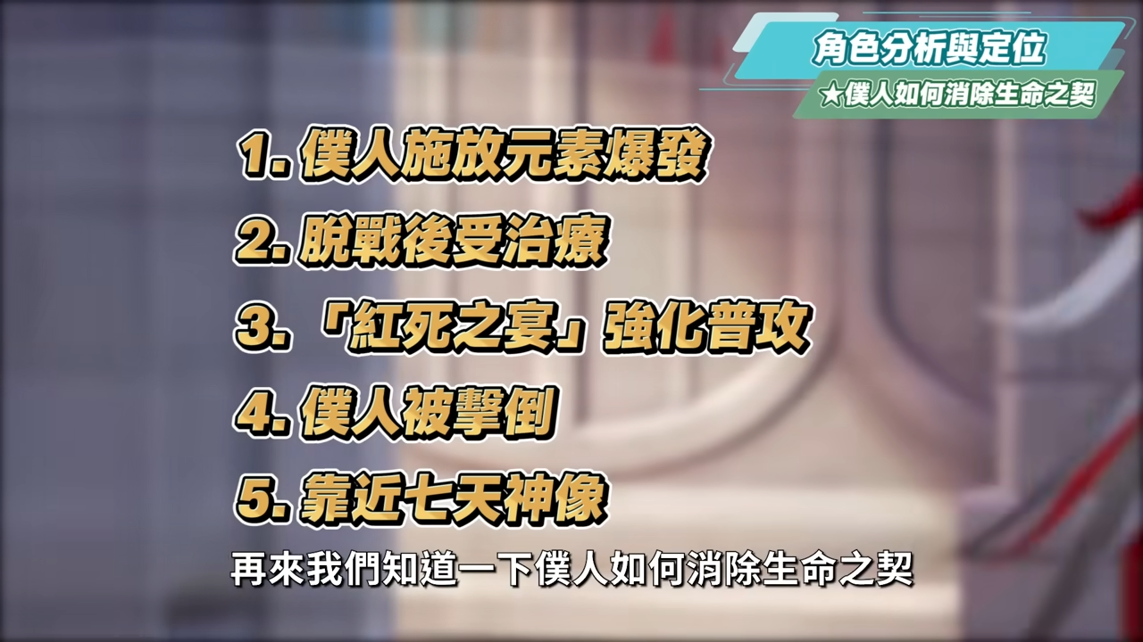 由於僕人固有天賦「唯厄月可知曉」的設定,在戰鬥狀態下,只能透過施放自己元素爆發的方式來恢復生命值,並且搭配元素爆發清空所有生命之契並且恢復血量。所以搭配第2點,僕人若是在戰鬥情況下,不論是搭配什麼恢復角色,僕人的生命之契都沒有辦法像一般情況下能被消除,因此就只有在脫戰情況,又受到治療恢復時,才能消除生命之契。第3點則是透過強化普攻的輸出方式,以每下普攻固定百分比的方式來消除生命之契,也是僕人主要的輸出核心機制。而若是僕人不慎被敵人擊倒的話,復活後,當前的生命之契也會全部清空,最後就是在大世界時,僕人身上有生命之契的情況下,靠近七天神像時,即便是在戰鬥狀態下,僕人的生命之契也會一次清空,同時恢復生命值,就不會受到固有天賦的限制。