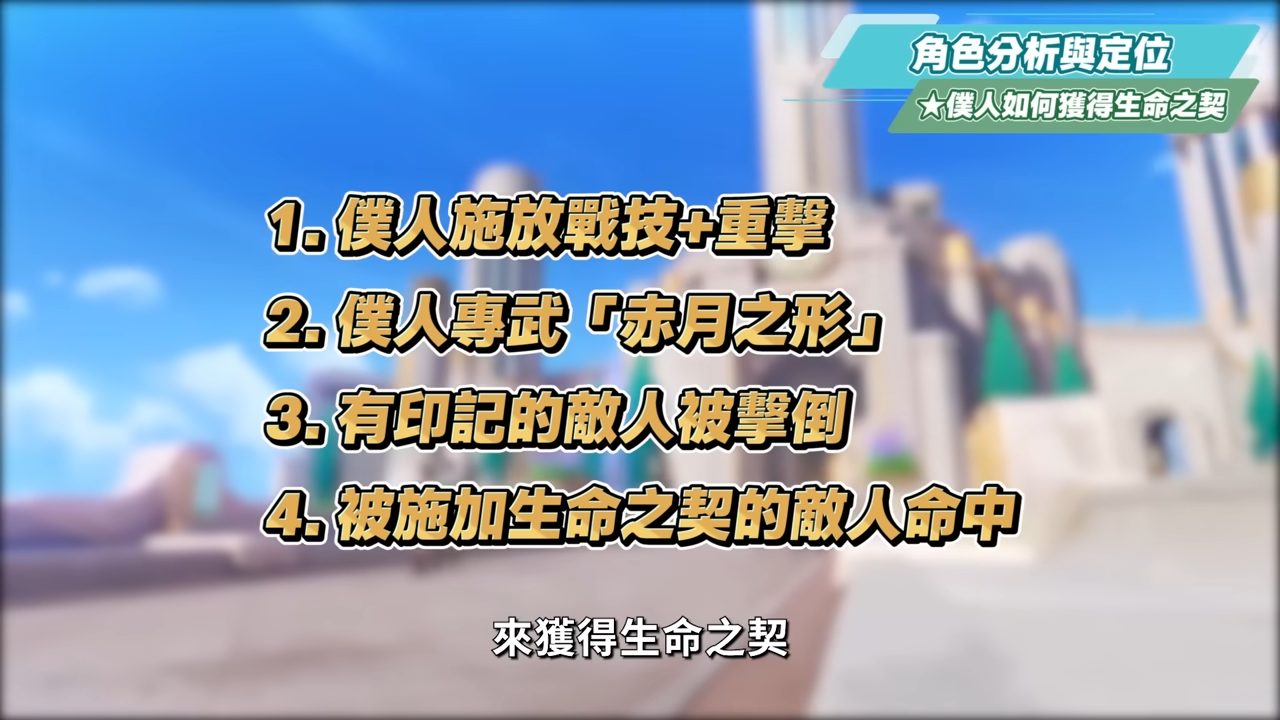 目前僕人可以透過四種方式來獲得生命之契,第一種就是透過戰技施放,再搭配重擊回收,就能按照印記的狀態來獲得不同比例的生命之契,這部分稍後會在技能的部分再作說明。而第二種是透過僕人的專武「赤月之形」的武器特效,重擊命中敵人時就能獲得25%的生命值上限的生命之契,這把武器也是目前所有長柄武器唯一一把可以附帶生命之契的武器。第三種是搭配固有天賦「唯苦痛可償還」的機制,若身上持有印記的敵人被擊倒後,僕人可以直接獲得130%的生命之契。第四種則是被能夠附加生命之契的敵人命中,像是前面有提到的風役人、霜役人,假如被敵人附加生命之契,達到了僕人可以啟動強化普攻的生命之契大於生命值30%以上的要求條件時,僕人也可以發動「紅死之宴」狀態。