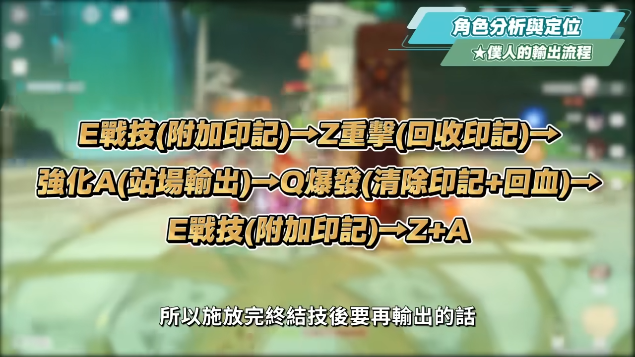 不過也因為EQE這個動作會大概佔據4秒左右的時間,假如隊伍中有搭配一些穿戴翠綠之影4件套的風元素輔助角色時,風套4件減抗的時間只有10秒,再加上切換角色開招的時間,有可能會來不及讓僕人的站場普攻能吃到BUFF,同時還有可能需要等普通印記升級成強化印記「血償勒令.結」的那5秒,因此在未滿2命的情況下,就可以是先讓僕人施放E,再切換其他要上BUFF的角色,最後再換僕人上場重擊+普攻,最後EQE收尾,才能確保僕人的核心普攻傷害能吃到盡量長時間的BUFF。那如果是2命以上的僕人,因為2命效果可以直接讓施放的印記,直接升級成強化版的「血償勒令.結」,或是要打蒸發反應這種隊伍,會希望讓終結技傷害吃到增傷的需求,因此就可以直接先E起手,或是直接隊友先開招,僕人最後QE接重擊+普攻,不用等那5秒。
