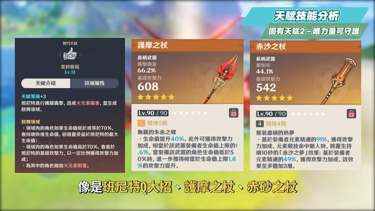 解鎖固有天賦2「唯力量可守護」,主要是增加僕人的生存能力,會基於僕人攻擊力每超過1000點的部分,每100點攻擊可以使僕人獲得1%的全元素抗性和物理抗性,最多可以提升至20%,會直接顯示在角色面板上,假如要吃滿20%的話需要攻擊力3000。像是班尼特Q大招、護摩之杖、赤砂之杖這種會有基於某數值轉化為攻擊力的效果,是不能被計入到僕人的天賦效果中來轉化抗性,但若是搭配穿戴宗室4件套、千岩4件套、討龍英傑譚這種直接加攻擊力的效果則可以被計入到僕人的天賦轉化,因此主要透過輔助角色來提供這方面的攻擊力補足即可。