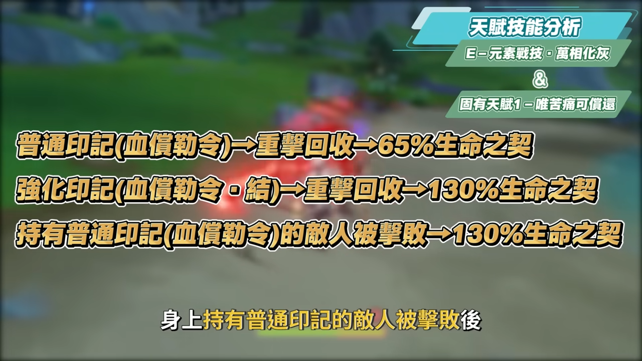 戰技和固有天賦1的機制緊密連動,所以洛洛放在一起說。戰技是僕人疊加生命之契的主要前置,施放後會對周圍敵人造成火元素傷害,一共打出2段傷害,視為戰技傷害,而後朝離自己最近的敵人突進,並且施加「血償勒令」的X型印記,印記被附加的範圍判定蠻廣的,有時候面對群怪時,身後的小怪也可以被附加上印記,戰技命中可以產生5顆火元素微粒。印記可以持續30秒,每5秒造成一次火元素傷害,可以透過重擊或是Q元素爆發來回收印記,這個印記可以分為兩種,一種戰技附加在敵人身上的印記「血償勒令」,只要重擊回收1枚這個基本的印記,就可以為僕人附加65%的生命之契,而如果是在印記經過5秒,搭配固有天賦「唯苦痛可償還」的機制,印記就會升級成「血償勒令.結」,變成強化版印記,強化版印記的X印記也會變得更紅,這時透過重擊回收印記,僕人就可以直接獲得130%的生命之契。另外一種則是身上持有普通印記的敵人被擊敗後,也會讓僕人直接獲得130%的生命之契。