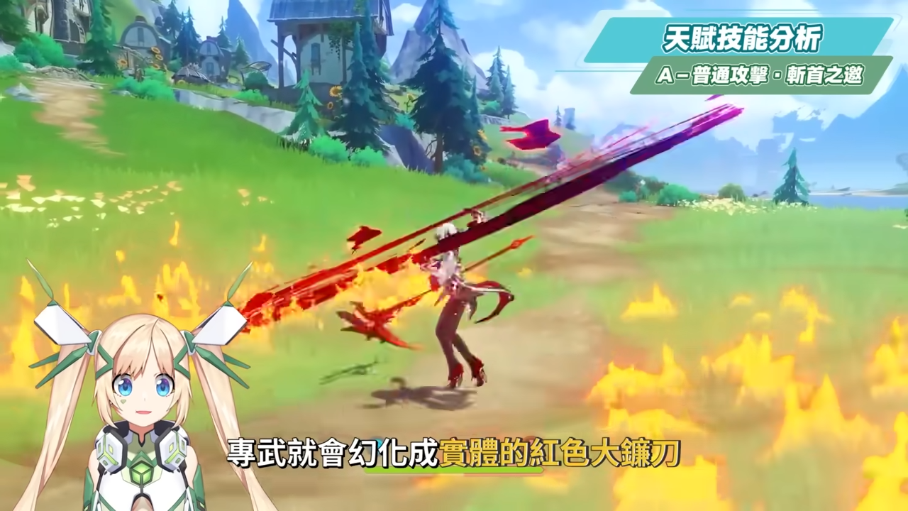 僕人的普攻為其主要輸出手段,攻擊動作一共有6段,手感表現不錯,收刀動作也很帥氣,女玩家也會被俘虜的程度,第6下的後搖動作比較長,所以一般可以主打前面5段,第3段的揮擊在面對一些小形怪時,也能有類似一種能把敵人拉近的效果,第4段攻擊可以造成2次傷害,也可以一次扣除2次生命之契以及減少2次戰技CD。也因為僕人在持有武器時,會有特殊的效果,假如持有專武「赤月之形」的話,在第2~6段普攻時,專武就會幻化成實體的紅色大鐮刀,重視外觀的外貌協會很容易會因此而想挑戰武器池,而若是持非專武以外的長柄武器的話,則會變成類似帶殘影的鐮刀,整個感覺就有落差。而僕人的重擊施放後會有一小段向前突進的效果,並再搭配一個弧形的揮砍,實戰中主要是用來回收E戰技附加的印記,給僕人自己套上生命之契。而重擊和下落攻擊都不會消除生命之契。若是再繼續長按重擊的話,僕人會展開左半邊的翅膀,以消耗體力的形式進行快速的浮空飛行,大約可以維持5秒,不論是在水上移動或是爬一些山坡都很不錯,重點是超帥。