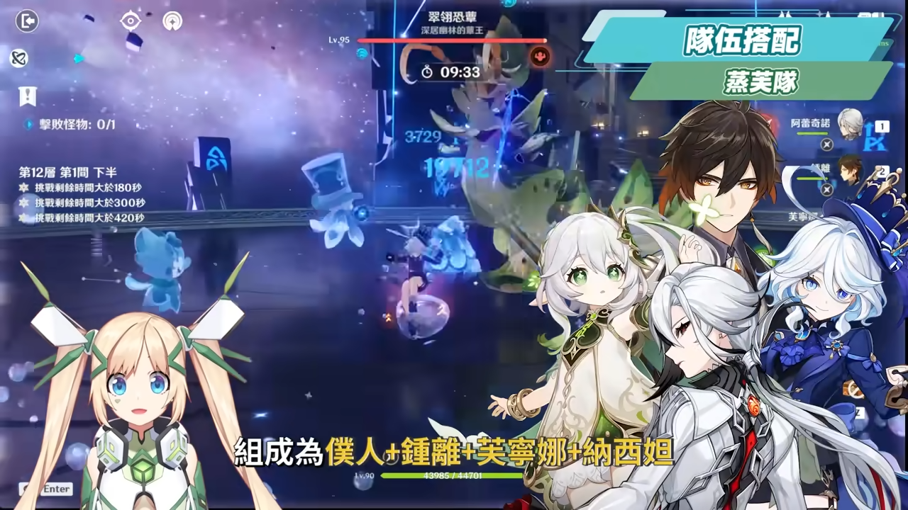 再來也要組一個膨脹之神芙寧娜搭配僕人的隊伍,組成為僕人+鍾離+芙寧娜+納西妲,主要是透過僕人和納西妲的燃燒反應,使敵人處於火附著狀態,而芙寧娜的戰技攻擊可以觸發蒸發反應,鍾離提供的護盾可以保護我方角色,只是這樣的陣容會建議最好芙寧娜有滿命,才能夠有全隊回血以及讓生命值有足夠的額度讓芙寧娜持續扣生命,或是將納西妲換成群體瞬補的角色,才能夠搭配非滿命芙寧娜,像是琴團長,而這樣也可以在部分情況下讓僕人和芙寧娜打蒸發反應,雖然觸發上可能不是那麼穩定,不過私心希望這兩個角色有點火花吧! 畢竟芙寧娜愛吃蛋糕的樣子跟克雷薇真是像~