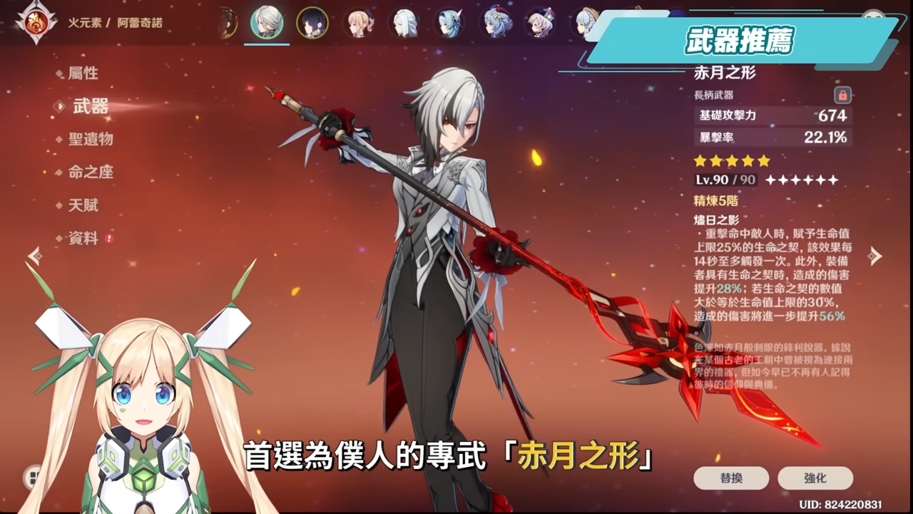 僕人的武器推薦,首選為僕人的專武「赤月之形」,不只是有僕人專屬的鐮刀特效外觀,更甚至是這把武器也是全部長柄武器中唯一會附加生命之契機制的,每輪戰技若有吃滿上限,就可以獲得145%+25%=170%的生命之契,也等於讓僕人有更多次的普攻輸出和CD冷卻,換做其他角色拿,雖然重擊時也會附加生命之契在自己身上,可是效果上並不契合,目前來看也是為僕人量身打造的武器,而且也有全傷害加成,不論是輸出還是觀賞,都是最棒的。而如果沒那麼在意外觀,其實和璞鳶可以說是和專武差距最小的五星武器了,兩把武器滿級情況下都是674攻擊力白值與22.1%暴率,並且和璞鳶的效果也能提升普攻傷害,算是最適合的下位替代選擇。其他可以考慮的,會推薦是雙暴類的長柄武器,像是護摩之杖能給到大量暴傷,只是武器效果要求要半血以下的機制比較不適合僕人。四星武器中有雙暴的長槍像是紀行武器的決鬥之槍,外觀上也紅紅的,和僕人稍微有那麼一點搭?以及峽灣長歌,只是這把武器比較適合用來打蒸發反應,最後就是最容易取得的白纓槍,只是僕人拿白纓槍感覺氣勢就弱了不少,乾脆直接拿仙女棒賣萌好了。那如果連雙暴武器都沒有,還能考慮的就是攻擊力長柄武器或是元素精通長柄武器,攻擊力長槍像是貫虹之槊、息災,元素精通長槍適合打蒸發反應,像是赤沙之杖、匣里滅辰,又或是天空之脊等等。