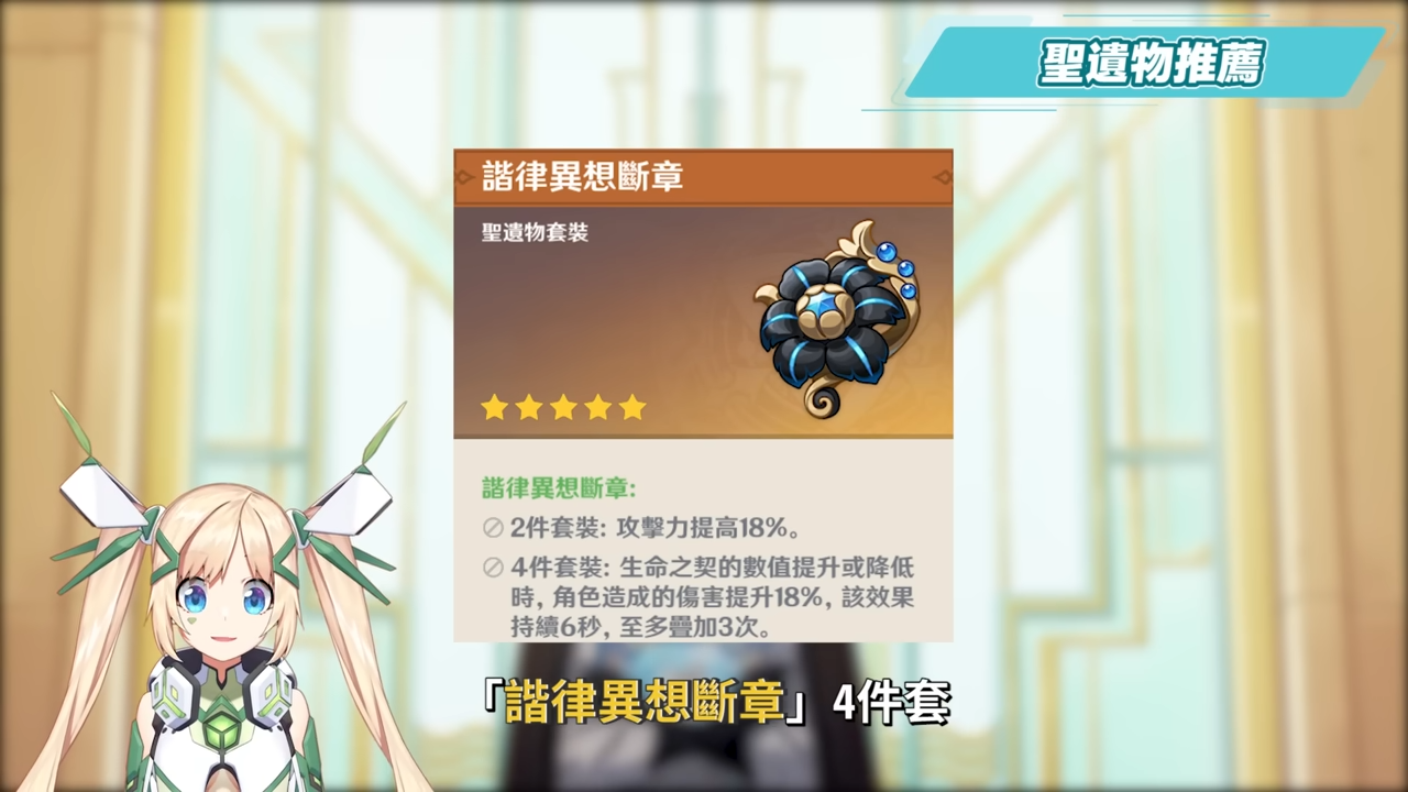 僕人的聖遺物推薦為楓丹4.6版本新出的生命之契套「諧律異想斷章」4件套,能夠提供18%攻擊力和最高54%的全傷害加成,原本僕人2命的回收印記所造成的900%攻擊力傷害,是一個獨立且吃不到普攻、戰技、元素爆發加成的傷害,但搭配能加全傷害的聖遺物套裝效果之下,這個傷害就能吃到增傷,搭配僕人自身的生命之契機制,也是當前最適合僕人的畢業套裝。也因為聖遺物才剛出,前期也需要一段刷取的過渡時期,此時可以考慮的會像是以普攻傷害為主的角鬥士4件套,可以提供18%攻擊力和35%的普攻傷害加成,而另外一套也主打普攻傷害的來歆4件套,成形的套裝也和角鬥士4件套的差距不會落差太多,角鬥士在效果觸發上會比較穩定,而來歆套則是比較要靠運氣,可以看哪一套屬性比較好就先用。而如果是需要打元素反應體系的需求,像是蒸發、超載等等,就可以考慮魔女4件套,如果是起手先E戰技再切換角色的話,4件套效果就只能吃到1層,若是搭配E重QE重的手法則可以吃到2層,也就是30%的火傷加成,再搭配面板大約堆個60~180左右的精通,就可以在反應傷害的表現上有很不錯的數字。若是沒有以上4件套,就任選其中的2套做過渡,像是攻擊力2件套+火傷2件套,又或是普攻2件套。但最後還是要以諧律4件套做為最終目標。