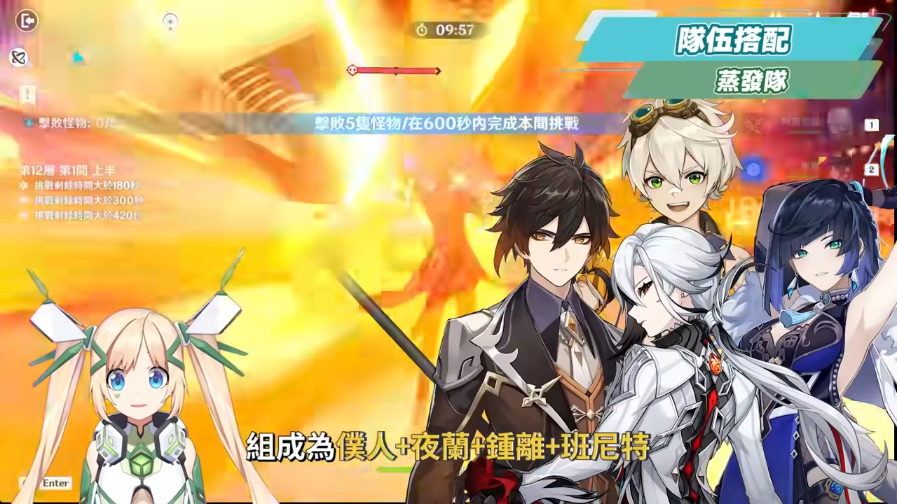 蒸發隊的陣容可以參考胡桃,核心隊員為夜蘭和班尼特,組成為僕人+夜蘭+鍾離+班尼特,主要就是把剛剛的純火陣容的萬葉換成了夜蘭,真的沒有夜蘭也可以換行秋,只是蒸發反應的觸發並沒有純火隊穩定,但有機會可以打出比純火隊更高的傷害上限,像是元素爆發施放的時機抓得好就能夠打出漂亮的大數字,而僕人雖然有點類似胡桃只能透過Q大招回血,但僕人可以配攻擊奶,同時普攻的手感也更好。輸出手法可以是僕人起手E→鍾離長E→夜蘭EQ→班尼特QE→僕人重擊+普攻一輪搭配夜蘭上水→Q+E+重擊+普攻。後續有要打核爆也可以把鍾離換成莫娜,或是想要更穩定的掛水,也可以再換上行秋配夜蘭兩個後台掛水輸出。