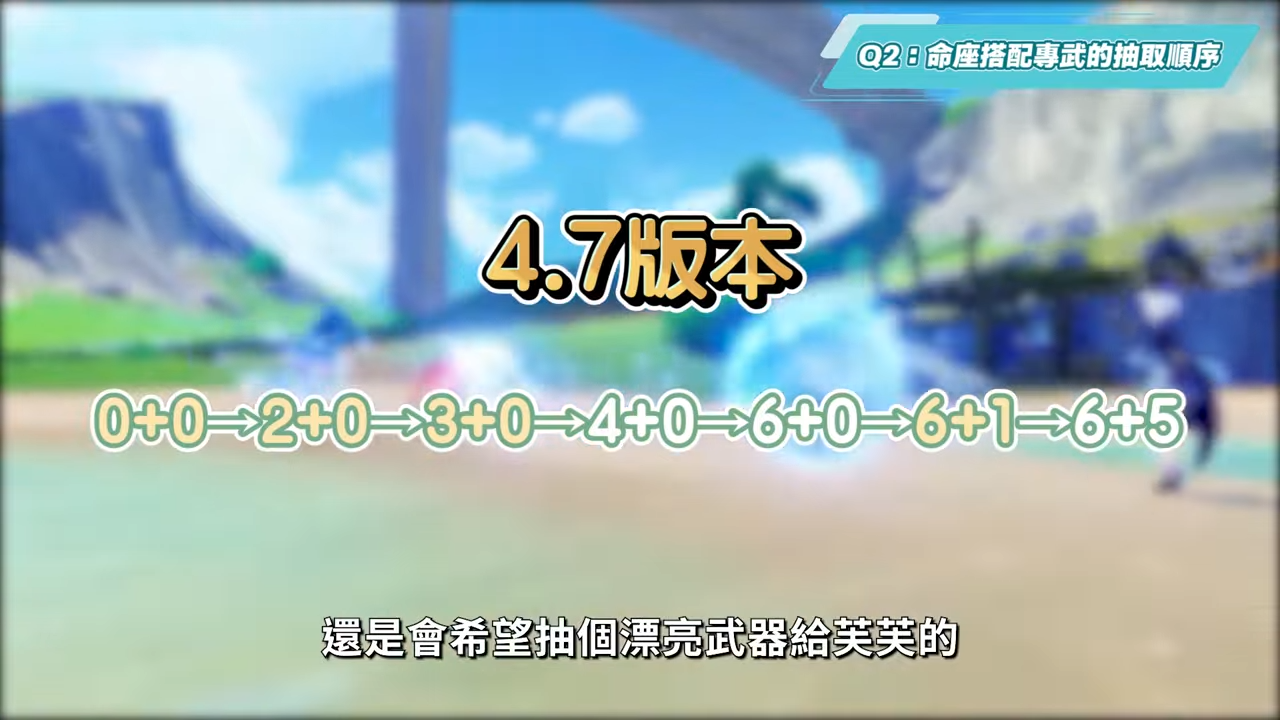 還有像是命座搭配專武的抽取順序建議,也都可以從先前芙寧娜影片裡面17:31開始的地方查看順序。而4.7版本唯一要補充的就是,因為這次芙寧娜的專武是和希格雯的專武同一卡池,而希格雯的專武非常專屬於希格雯使用,除了她以外,能用的角色不多,因此也就代表這次卡池是比較毒的,所以假如沒有要抽希格雯、卻還是想抽芙寧娜專武的話,那麼就要慎重考慮,歪了的話自己是不是可以承受,但也因為芙寧娜真的還有很多替代武器,所以就算已經抽到6命卻還是沒有專武的話,其實影響比較大的部分也只有外觀而已。後面也會再補充沒有專武的其他武器替代給大家參考。