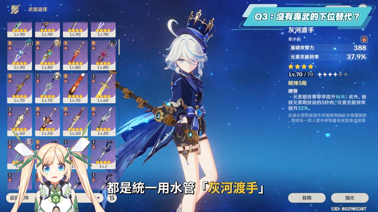 雖然芙寧娜本身有很多的下位武器替代,不過也因為芙寧娜從登場到現在,中間也有多了一些下位武器,所以洛洛在這邊也再補充一些新的下位替代武器。不過還是老話一句,4命以下的芙寧娜都是統一用水管「灰河渡手」,這是最經濟實惠又好用的。4命以下的芙寧娜,請優先堆疊你的充能到能夠無縫開大,再來才考慮其他輸出武器,而且在搭配輸出武器前,你的生命值也要盡可能堆高,否則光有雙暴也沒辦法有漂亮的傷害。而若是4命以上,或是充能達標,可以考慮雙暴武器時,像是芙寧娜復刻前,這中間也出了千織的專武「有樂御簾切」,也是加普攻和戰技傷害,而且滿級還有88.2%高額暴傷。其他也還有很多雙暴類武器,像是磐岩結綠>裁葉萃光>波亂月白經津>霧切之回光,有什麼用什麼,那如果是要用滿命的白芙去打蒸發核爆的話,也可以用高精煉的聖顯之鑰。可以用來打9,999,999的OP數字。若是懶得釣魚的話,其他充能武器也就只有天空之刃、或是老玩家才有的腐植之劍、跟要堆暴率到50%以上的西風劍、有買紀行的話,滿精煉的狼牙也會和灰河渡手不相上下,甚至可以省去釣魚的時間。所以芙寧娜的武器選擇來說有非常多,因此其實若不是因為外觀的話,真的也沒有到非專武不可。