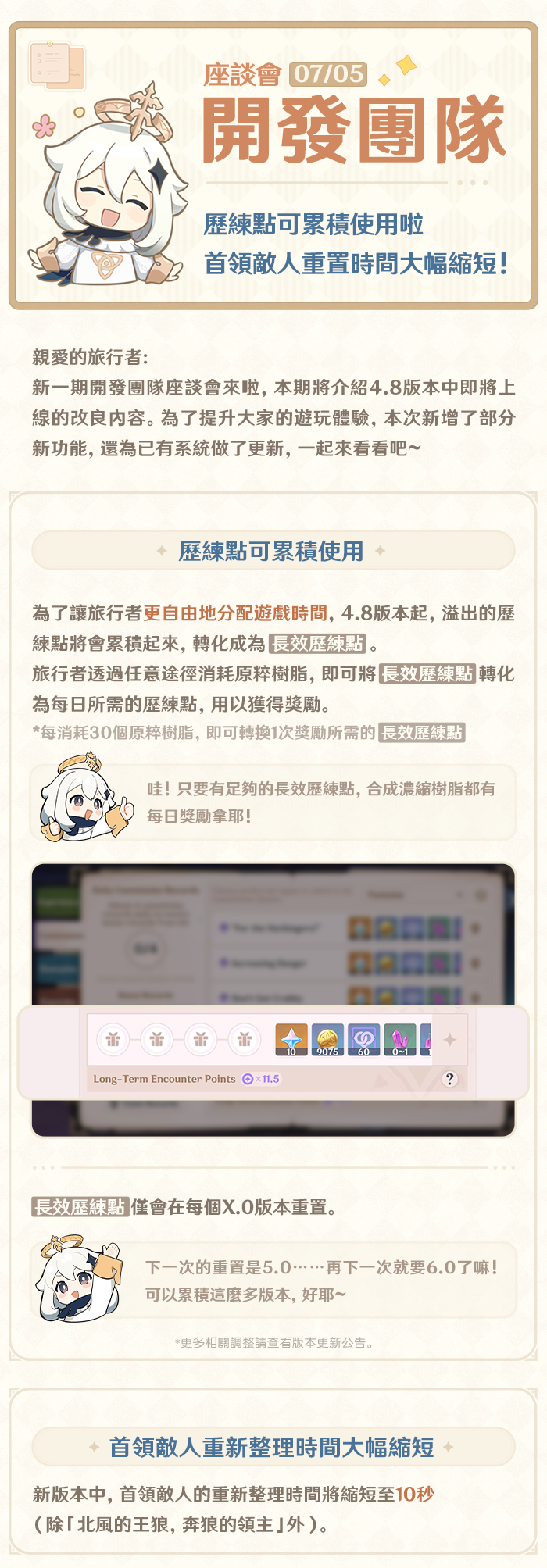 標籤:4.8 Genshin Impact 世界等級調降功能開放時機調整 原神 大幅縮短 對話新増回顧和隱藏 UI 功能 座談會 新增隱藏主介面功能 歷練點 歷練點可累積使用 深境螺旋角色配隊介面改善 蒙德璃月部分秘境難度調整 遊戲官方公告 部分任務內挑戰玩法調整 重新整理時間 開發團隊 開發團隊座談會 首領敵人 首領敵人重新整理時間大幅縮短