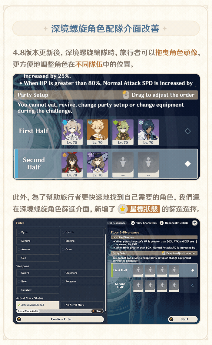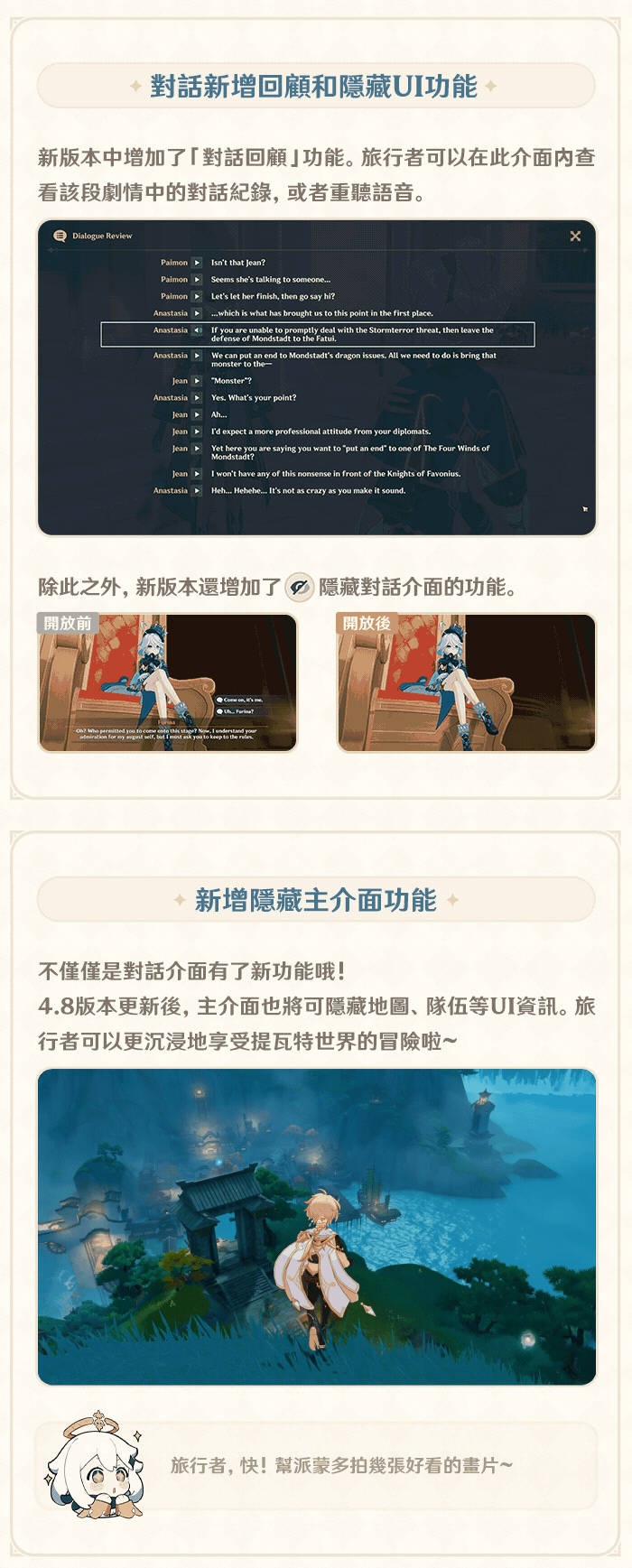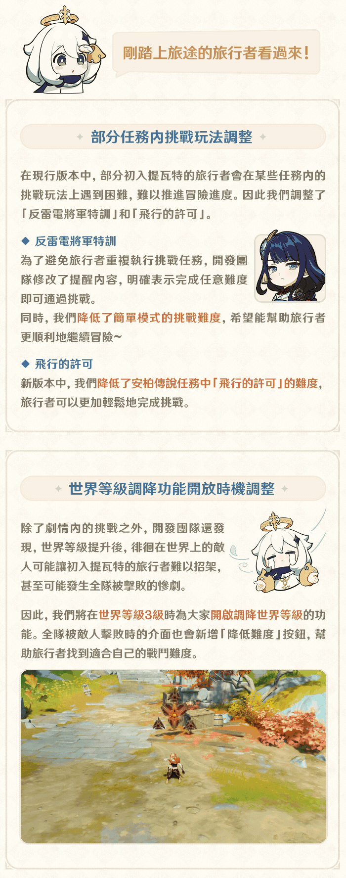 以及,關於較多旅行者意見回饋的「角色獲得過於隨機」的問題,實際目前已經有「定向推送特定角色」的機制,但由於機制過於隱晦,導致效果並不理想。我們也會在後續更新中改善角色的獲得方式,例如在部分獲得角色的場合,向大家提供多選一的方案。