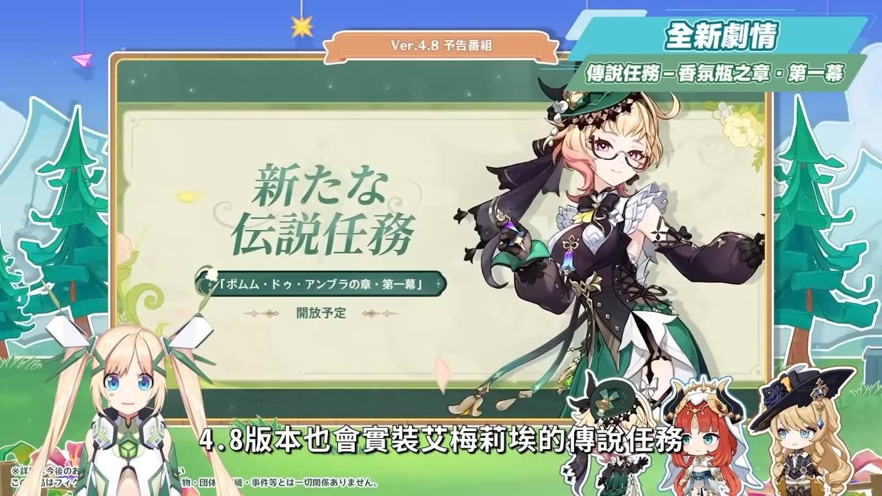 4.8版本也會實裝艾梅莉埃的傳說任務,讓我們了解有關這位楓丹最知名的香水設計師,不過艾梅莉埃也還有另外一個特別的身分,那就是「現場清理人」,這個工作主要是在案件調查完後,負責現場收尾和打掃的工作。此外在劇情中,會有一個神祕花種「奧古斯都」會在須彌現身,我們將會和艾梅莉埃一同前往調查一系列謎團,探查背後的真相。