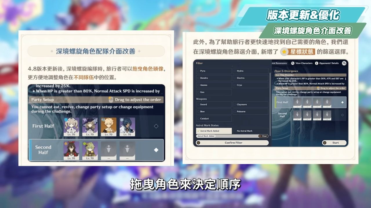 在深境螺旋選擇出戰角色時,後續也可以直接在介面上拖曳角色來決定順序,並且也可以從篩選介面中,優先看到自己標星號的角色。