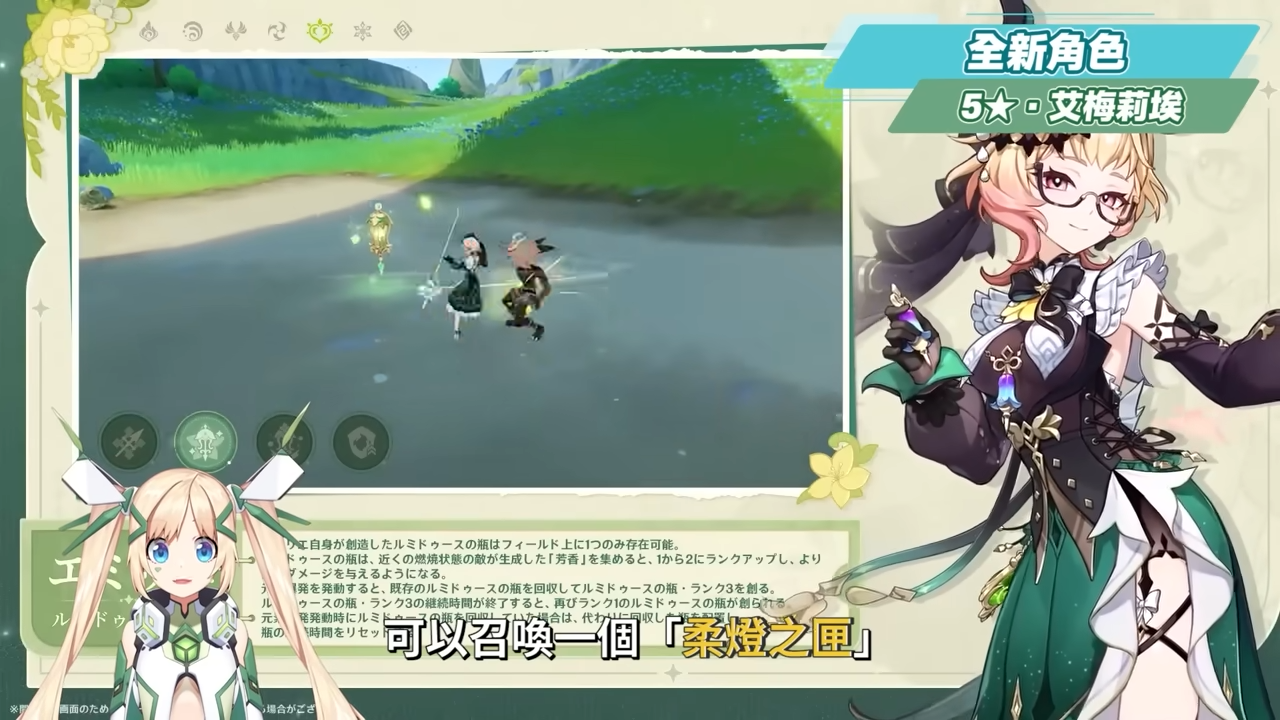 4.8版本中只有一位新角色,也就是草元素的艾梅莉埃,其角色定位是主打戰技傷害的草元素副C。艾梅莉埃的戰技施放後可以召喚一個「柔燈之匣」,有點類似草主的大招,會間歇性地對附近的敵人進行草元素攻擊,而若是附近的敵人處於燃燒狀態下的話,這個「柔燈之匣」就可以獲得升階,升階後「柔燈之匣」可以造成額外的草元素傷害,並且原本的攻擊範圍和傷害量也都會獲得提升。這個「柔燈之匣」即便切換角色時也能持續留在場上,因此也有些類似八重神子的殺生櫻,能夠在場上進行長時間的後台掛草。那如果是施放元素爆發的話,艾梅莉埃則可以創造一個最高階的「柔燈之匣」,會進行一段時間的高頻率草元素攻擊,而後再回復為一階的「柔燈之匣」,而雖然艾梅莉埃是主打草元素傷害,但這個角色並不是像原有草元素體系那樣依賴元素精通,而是主打草元素直傷,只是在有燃燒反應的基礎下,艾梅莉埃的草元素直傷可以獲得更高的提升,不過也因為具備長時間後台掛草的特性,因此就算不搭配燃燒反應,相信在配合一些需要後台長時間掛草的角色來打激化或綻放反應的隊伍來說,也會有適合的上場空間。像是搭配賽諾、又或是妮露綻放隊這種,並且打草元素直傷的情況下,也可以再讓原有的隊伍再提高更多的總傷害量,同時也可以搭配膨脹之神芙寧娜,大幅提高自己的傷害上限。