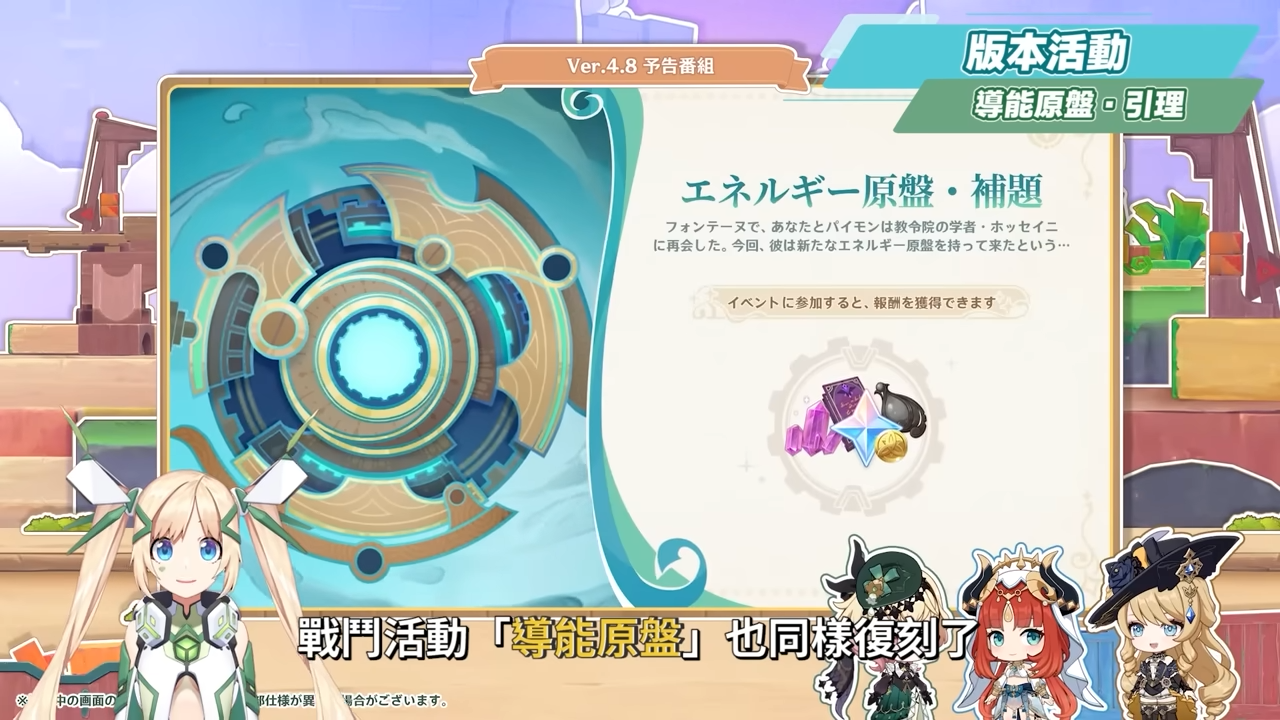 戰鬥活動「導能原盤」也同樣復刻了,這次胡賽尼將之前的研究和楓丹技術融合,製造出了「胡賽尼原盤」,希望我們能幫他測試看看戰鬥表現如何。這次的測試關卡中,我們需要組成三支隊伍,並進行連續三場的戰鬥,隊伍中的角色會根據自身的實力提供「驅動力」,同一個角色可以同時編到多支隊伍中,但重複出戰就不會再提供「驅動力」,而「驅動力」可以配置「地脈效應器」來獲得BUFF。