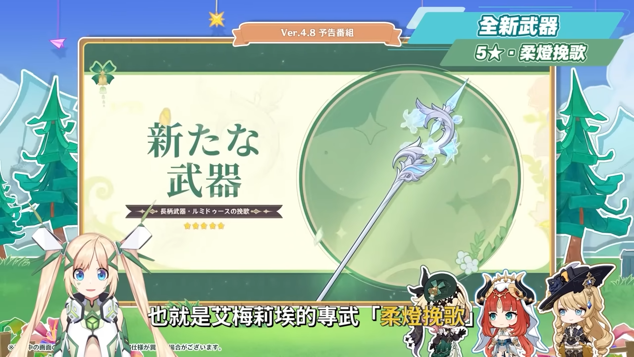 4.8版本的全新五星長柄武器,也就是艾梅莉埃的專武「柔燈挽歌」,因為艾梅莉埃是首個可以搭配燃燒套聖遺物的角色,而為了符合這個新體系角色的機制,艾梅莉埃的專武也可以說是非常為她量身打造。武器主屬性為暴率,效果可以提高攻擊力,並且在裝備者觸發燃燒反應或是對處於燃燒反應狀態下的敵人造成草元素傷害時,提高自身的傷害,同時還具備恢復能量的效果,因此這把武器也是專門設計給艾梅莉埃使用的武器。