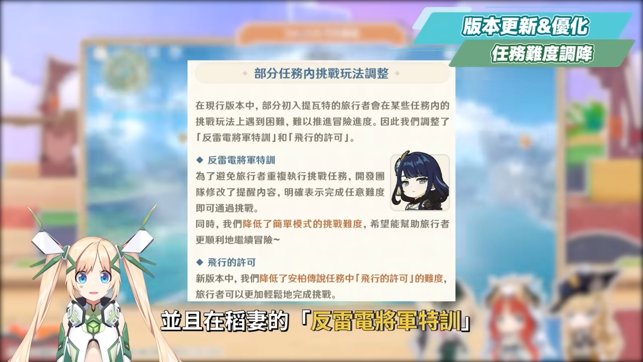 而一些支線任務的難度也下調,像是「飛行的許可」中,新手要找安柏考飛行執照時的難度也會更輕鬆,並且在稻妻的「反雷電將軍特訓」也會降低簡單模式的挑戰難度。