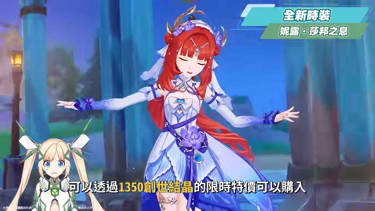 4.8版本也新增了2套新時裝,第一套為妮露的新時裝「莎邦之息」,按照過往慣例,妮露的新時裝將會在4.8版本期間,可以透過1350創世結晶的限時特價可以購入,而後會恢復原價1680創世結晶。