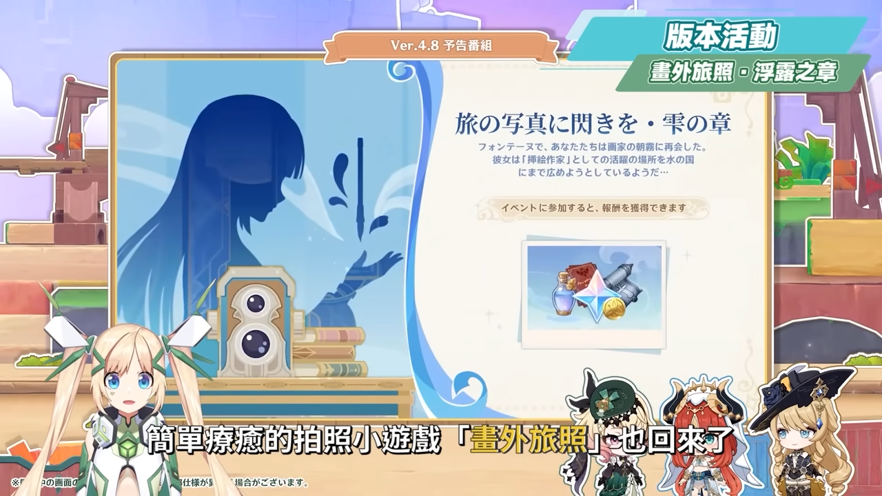 簡單療癒的拍照小遊戲「畫外旅照」也回來了,這次朝霧也來到楓丹了,並且這次的拍照條件也放得更寬,我們可以使用自己喜歡的角色來拍照,而且還加了連拍功能,讓旅行者可以更容易捕捉到最好的瞬間。