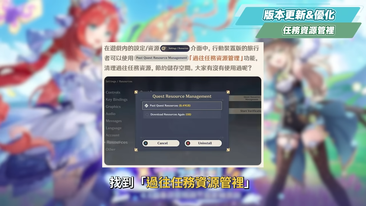 而手機端玩家後面也可以在設定/資源,找到「過往任務資源管裡」,就可以清除過往的任務資源,來讓你的手機解放空間,從示範畫面中可以看到,可以直接釋出8個G,這個功能應該是之前就有實裝的,若是還有不知道的手機玩家可以找看看,後續官方也會在4.8版本後直接出現標記提示來提醒。