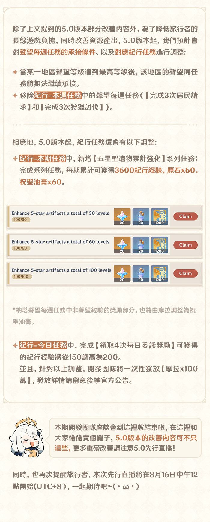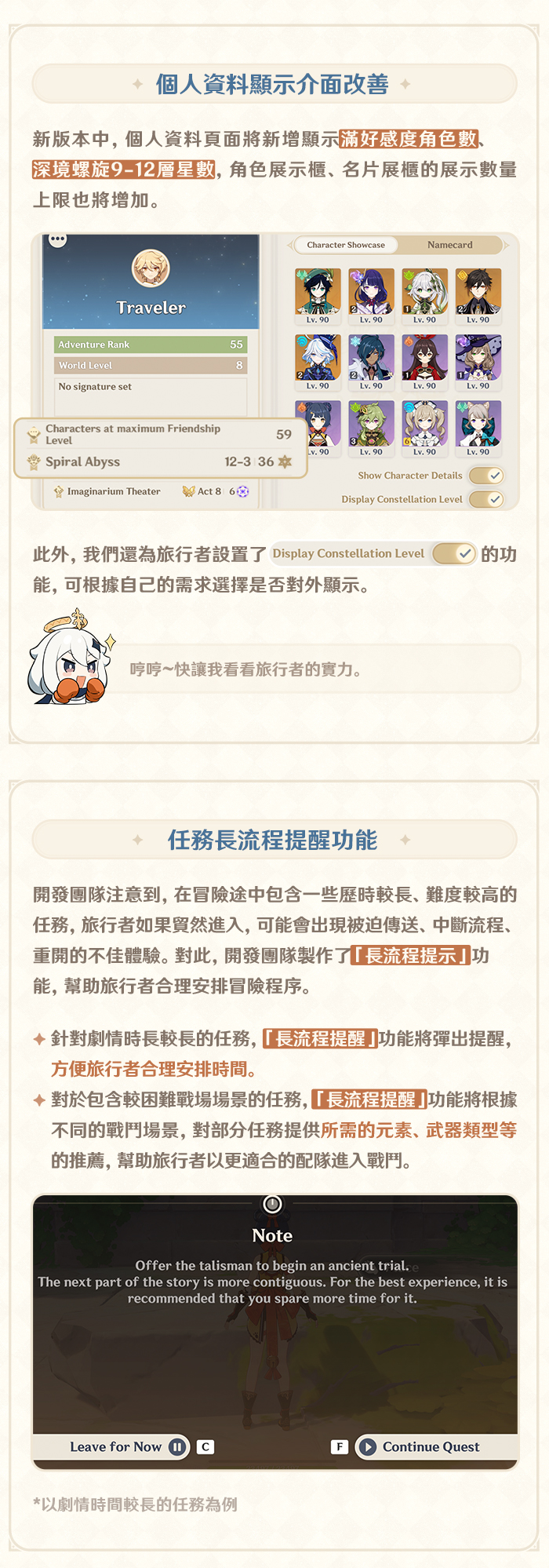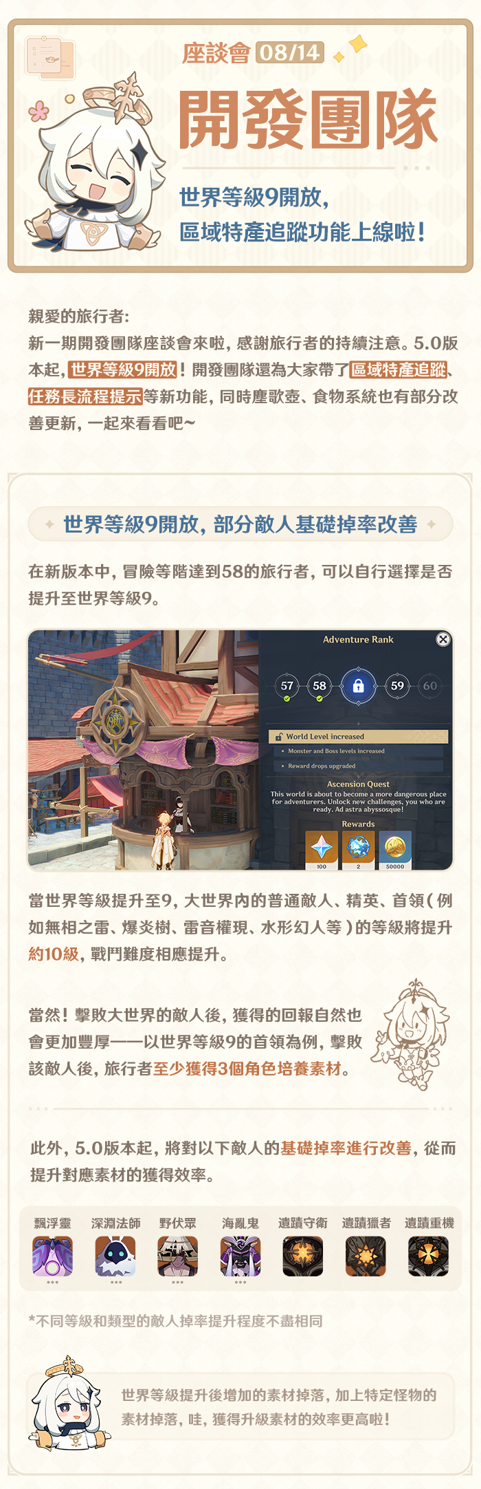 新一期開發團隊座談會來啦,感謝旅行者的持續注意。5.0版本起,世界等級9開放!開發團隊還為大家帶了區域特產追蹤、任務長流程提示等新功能,同時塵歌壺、食物系統也有部分改善更新,一起來看看吧~