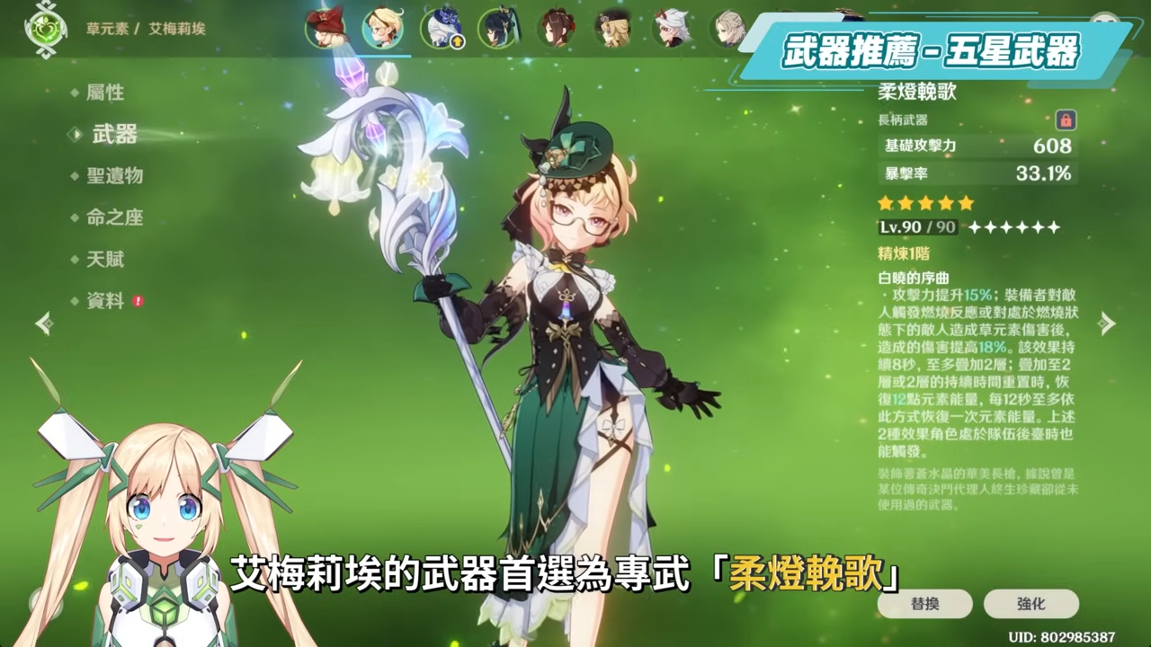 1命的機制是沒有其他武器或聖遺物可以替代的,因此1命的抽取推薦度會大於專武,抽到後再看自己是否要自帶一個草套還是有傷害又有充能、同時趁夜蘭武器陪跑時想要順便補個若水的,也都可以往武器池去抽。以上就是艾梅莉埃的角色評測全分析,希望大家都能更了解相關的技能機制與角色特性,我是虛擬Youtuber璐洛洛,我們下次見囉!