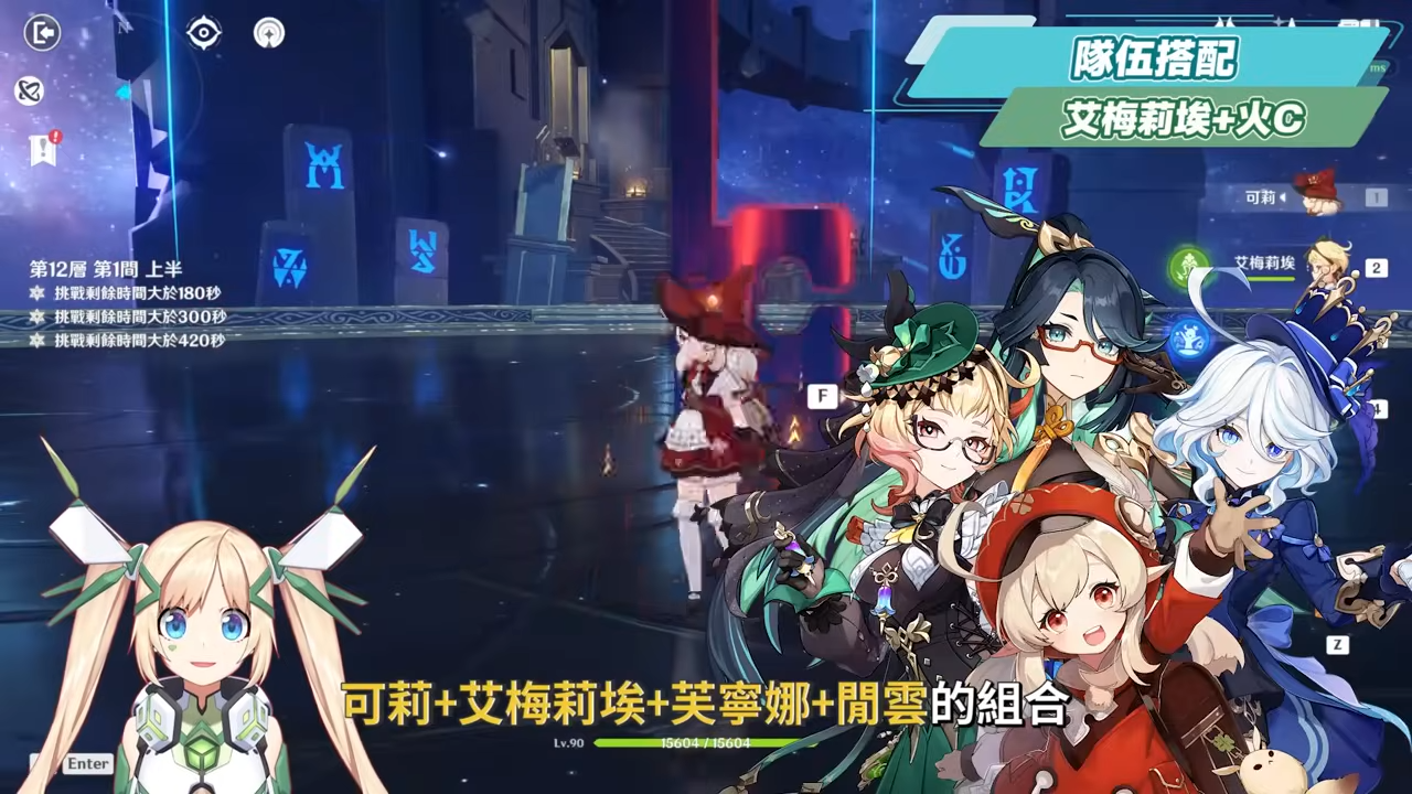 最後也分享關於艾梅莉埃作為工具人時的組隊情況,像是放在妮露綻放隊中時,可以作為一個掛草底的角色,若先前有抽妮露的新手、沒有納西妲的話,也可以考慮用這隊撐到納塔,後面有新的燃燒輸出後可以再作其他組隊變化。手法可以是妮露3E→艾梅莉埃QE→行秋/夜蘭EQE→瑤瑤QE跳A跳A的方式。