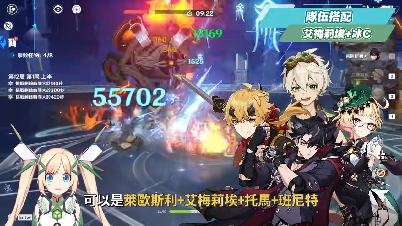 不過對於冰C來說,因為可以組成燃燒+融化的玩法,因此在傷害方面,冰C算是增幅得最明顯的,像是甘雨燃融或是萊歐斯利燃融,比起原本搭配納西妲的上草,敵人若是有多波次,或是在要轉火時,納西妲常常需要切出來重新掛蘊種印,但現在這個角色換成艾梅莉埃後,長時間的後台上草就會讓燃燒反應更順暢,也比較不用還要重新切出角色來補狀態。萊歐斯利的部分可以說是傷害直接明顯翻倍,並且打起來也更為舒適,原本洛洛的萊歐斯利打冰傷重擊是7萬x2,搭配艾梅莉埃的燃燒+融化後傷害直接來到17萬x2,換上申鶴後更是有來到20萬x2的傷害幅度。萊歐斯利的陣容就可以是萊歐斯利+艾梅莉埃+托馬+班尼特,手法可以是艾梅莉埃QE→托馬QE→班尼特QE→萊歐斯利E+5A+重擊,甘雨燃燒融化組合也是比起原本搭配納西妲時有更順暢的轉火能力,面對多波次的敵人時可以解省切換角色的過程,綾華的部分也算是拓展了一種全新玩法,因此冰C有練得比較多的話也都是可以嘗試看看冰C+艾梅莉埃+迪希雅/香菱+班尼特的組隊架構。