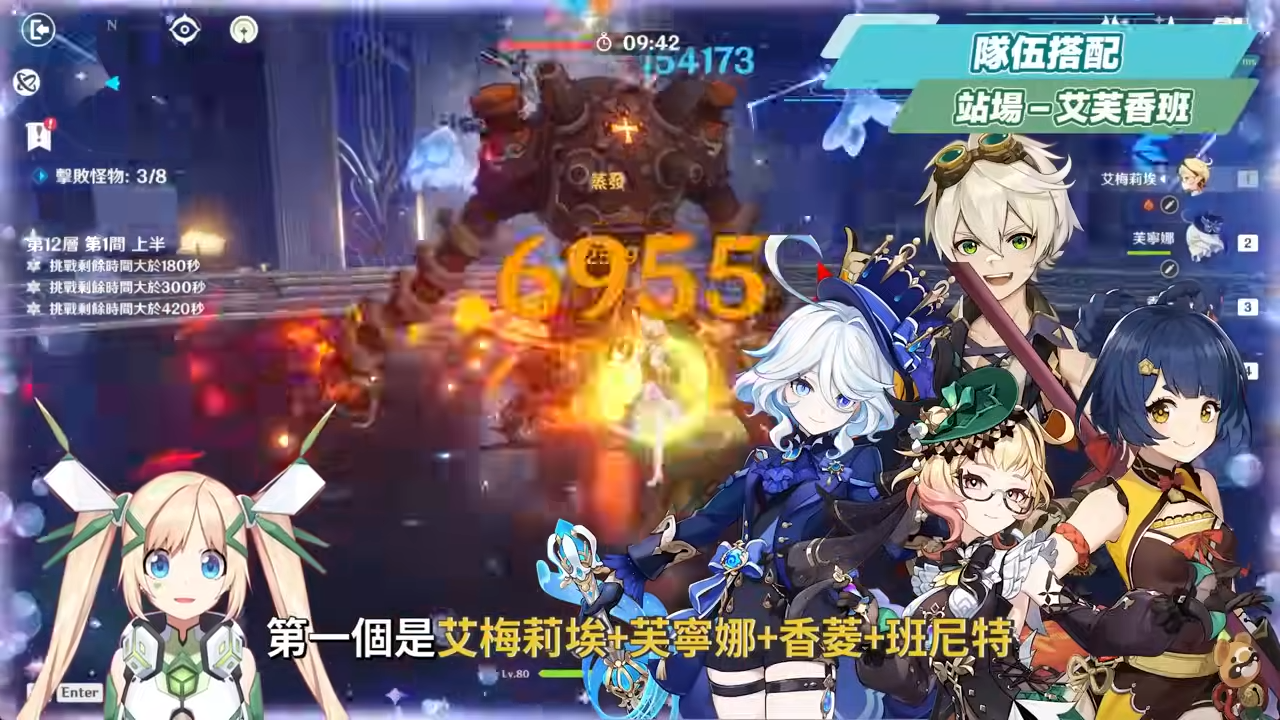 又或是搭配下落攻擊增傷的閒雲,同樣搭配滿命班尼特的火附魔,讓艾梅莉埃主打下落的火附魔傷害。主要由艾梅莉埃的戰技後台草元素傷害、芙寧娜的全增傷以及戰技後台水元素傷害、閒雲開大後加成的下落火附魔傷害,這隊陣容也比較適用於非滿命的芙寧娜。