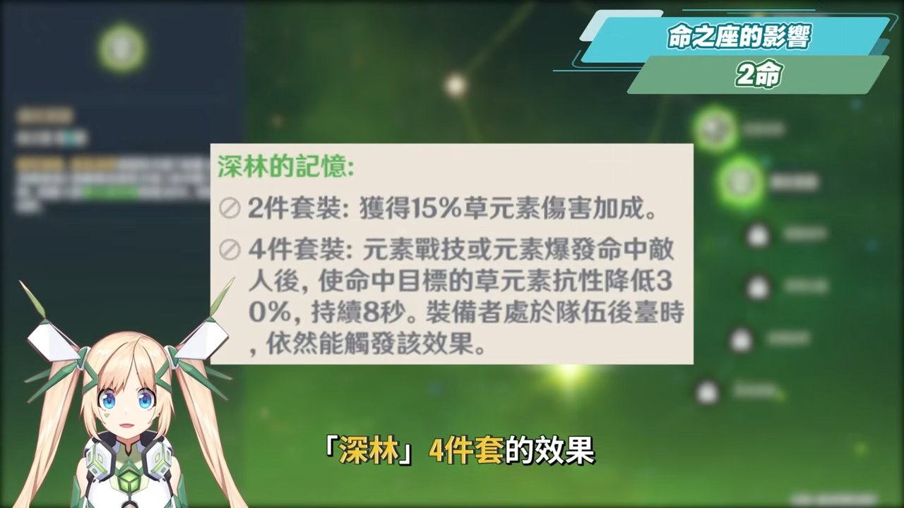 2命則是可以在技能命中敵人時使敵人的草元素抗性降低30%,可以看成是2命後自帶了一套「深林」4件套的效果,能提高隊伍中草元素角色的傷害,雖然持續10秒,不過因為艾梅莉埃技能的特性都是持續攻擊的,因此可以看成是常駐效果。草元素抗性的來源除了「深林」4件套和鍾離的護盾效果之外,就比較沒有什麼管道再有提升,因此算是一個比較稀有的乘區,不過若你的艾梅莉埃在聖遺物方面都會穿「深林」4件套,或是搭配鍾離護盾的話,2命的效果加成就會降低,因此換句話說,2命的艾梅莉埃其實就可以直接以「遐思」4件套作為唯一的畢業套裝即可。