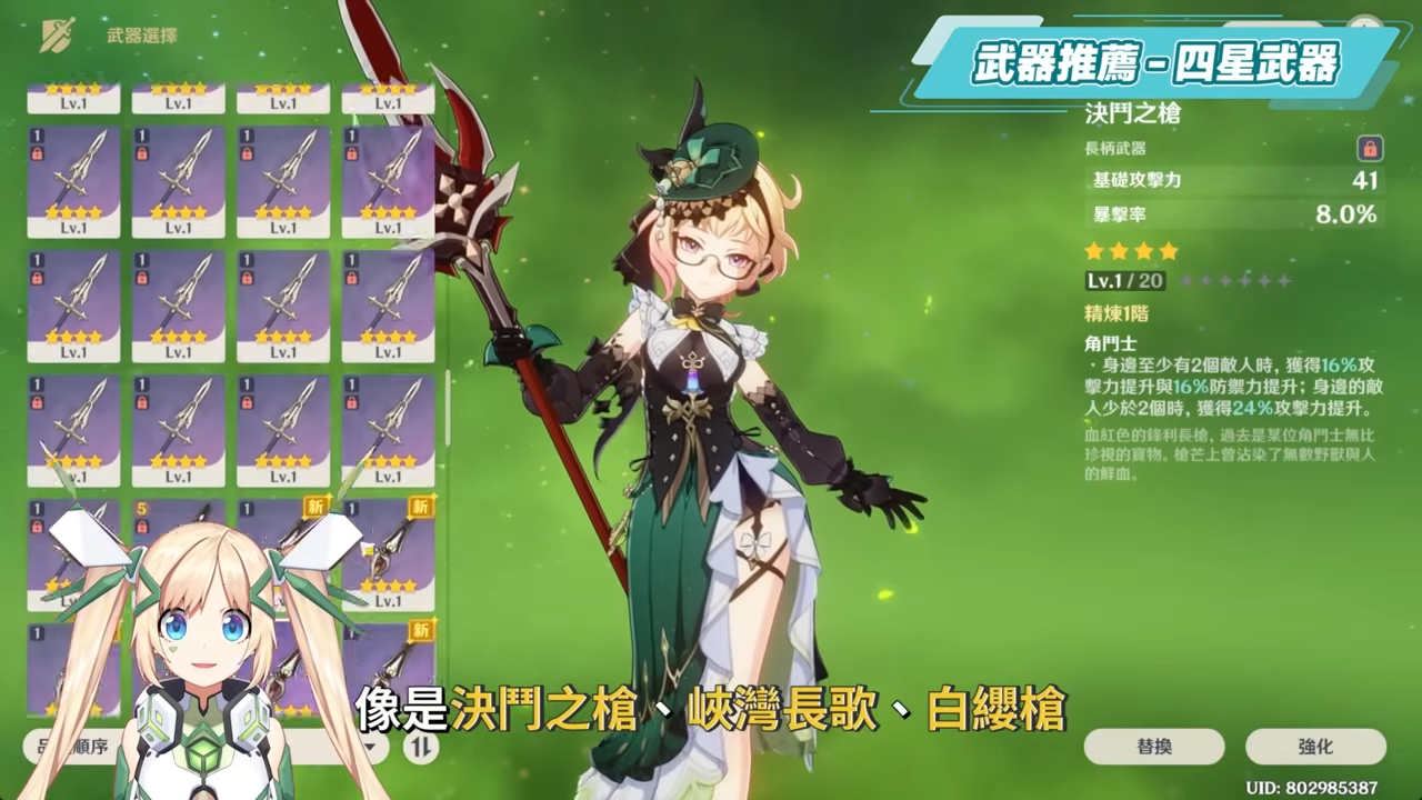 四星武器的部分若從暴率來考慮的話,像是決鬥之槍、峽灣長歌、白纓槍。加攻擊的則有風信之鋒、斷浪長鰭、勘探鑽機、千岩長槍等等。