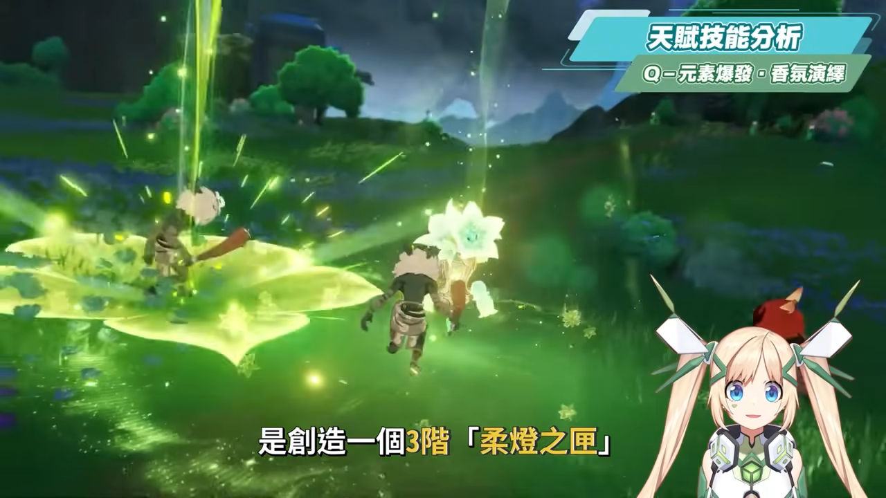 元素爆發主要的機制是創造一個3階「柔燈之匣」,並回收原本場上的「柔燈之匣」,同時保留當前的階級,能量需求50點,3階「柔燈之匣」持續時間只有短短的2.8秒,每0.3秒對範圍內敵人造成草元素傷害,這個範圍大小大約是班尼特大招的大小,為弱草元素附著,大約可攻擊9次,而單個敵人索敵的冷卻時間為0.7秒,所以若是對單的話大約就會只剩下4次,3階柔燈的傷害屬於元素爆發傷害,持續時間結束後會再放置回原本場上的「柔燈之匣」,並且重置原本戰技的持續時間。大招期間若場上有處於燃燒狀態下的敵人時,也會持續產生「香韻」,雖然3階柔燈不會蒐集,不過在2.8秒3階柔燈結束後,若退回1階柔燈也可以快速吸收旁邊產生的2枚「香韻」來進階。也因為開大招後的2.8秒內使用戰技的話不能再次產生柔燈,因此在開Q後立即接E可以補充一次戰技施放的傷害,或是芒性靈息之刺的攻擊,而後續的柔燈冷卻重置和升階也不會影響。