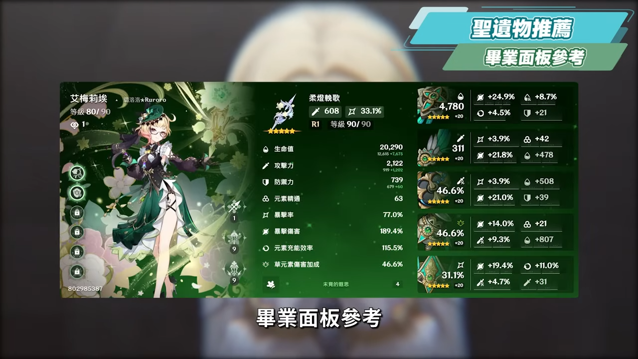 畢業面板參考,攻擊力主要在實戰過程中可以接近2400即可,暴率可以在70%以上、暴傷140%~170%以上,元素充能若只有艾梅莉埃一個單草,140%~150%左右即可無縫開大,若是雙草的話可以將標準降低至120%~130%。有抽專武「柔燈輓歌」或是有解鎖1命,也能再讓充能需求再低個10%~15%,幾乎就是不用再特別顧慮充能了。