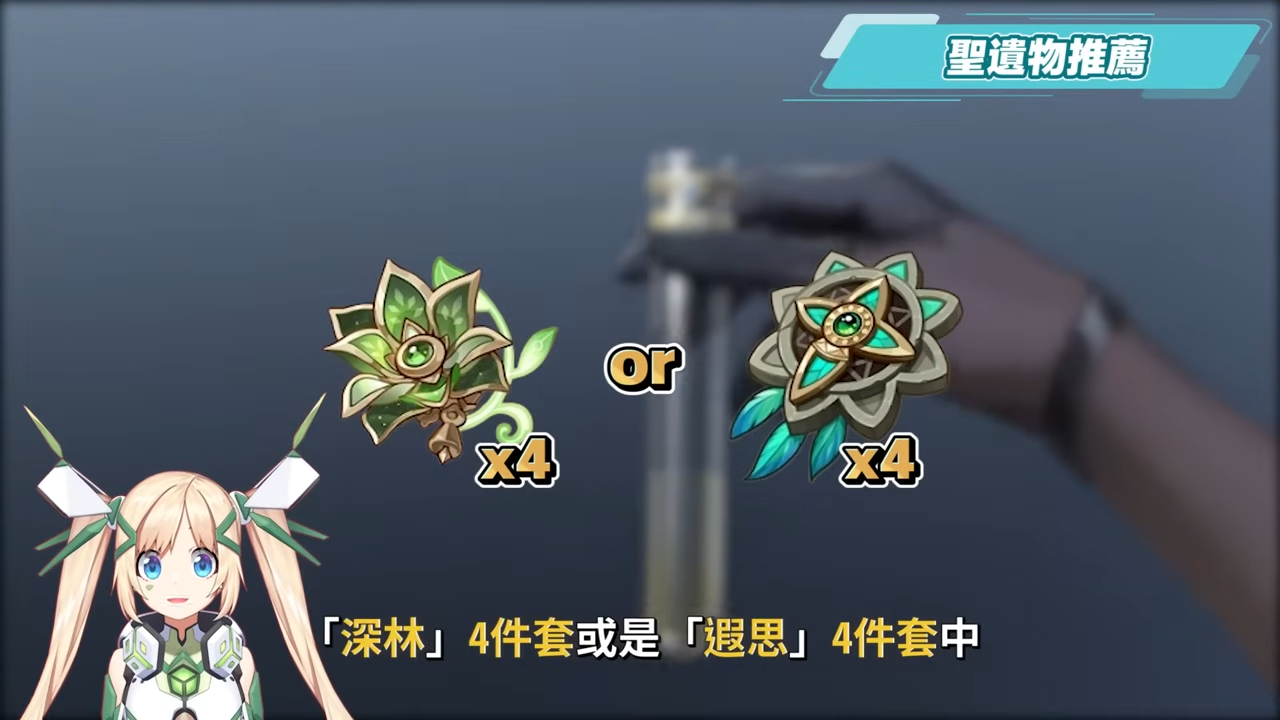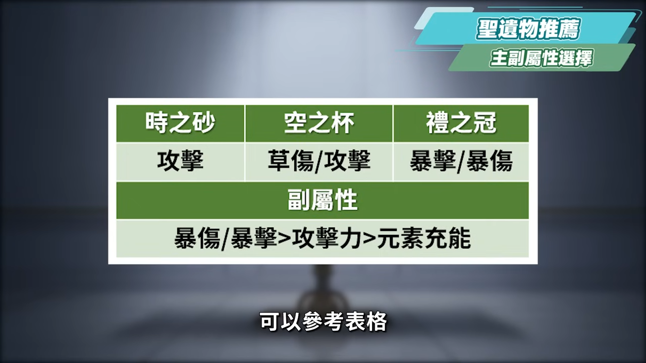 聖遺物主副屬性選擇的部分可以參考表格,時之沙選擇攻擊沙,可以拉高攻擊面板來盡量吃滿天賦2的增傷,空之杯選擇草傷或攻擊,差距不大,禮之冠根據面板缺少的選擇暴率或暴傷。副屬性則優先考慮雙暴>攻擊力>元素充能。