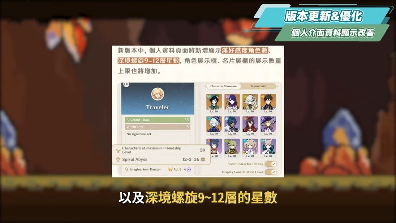 新版本中,個人資料頁面會新增顯示已滿好感度的角色數量,以及深境螺旋9~12層的星數,角色展示櫃、名片展示的數量上限也會增加。若是不想要給別人看,也可以自己選擇手動關閉。