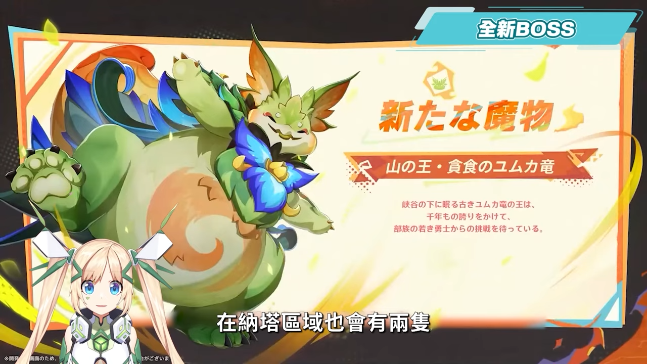 在納塔區域也會有全新的兩隻野外BOSS,其中一隻為「貪食匿葉龍山王」,看起來是一隻發福版本的匿葉龍,這隻胖匿葉龍沉睡在峽隙之下,以千百年來的驕傲做為賭注,等待部落的年輕勇士向牠發起挑戰,