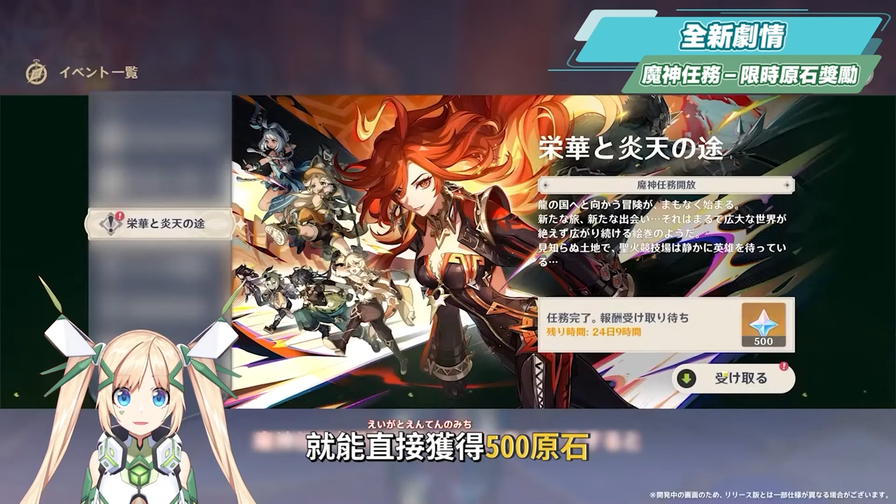在完成魔神任務主線第一幕後,所有玩家也可以免費獲得一隻四星卡齊娜。並且只要在5.0版本期間完成魔神任務,就能直接獲得500原石!包含在後續的5.1與5.3的魔神篇章中,也同樣會有限時完成就能領取的500原石,總共就有1500原石的獎勵。