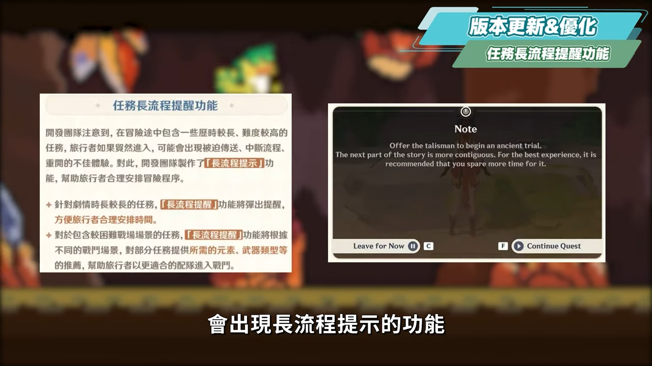 冒險途中會有一些時長較長的任務,後續在準備要進入這類長任務前,會出現長流程提示的功能,並且在一些戰鬥場景,也會有對部分任務所需的元素和武器類型的推薦,方便組建適合的配隊去戰鬥。