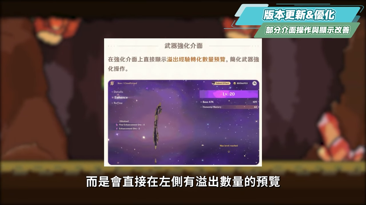 在合成濃縮樹脂介面,將會直接能預覽當前擁有的濃縮樹脂數量,並且可以自動選擇到目前能合成、且不超過上限的最大數量。強化武器介面若是有溢出的魔礦,後續也不會再跳出一個視窗,而是會直接在左側有溢出數量的預覽。在鍛造介面操作時,後續會自動選擇到可製作的最大數量,並且在重複鍛造時,可製作數量會繼承已完成的鍛造數量,離開後介面重置。