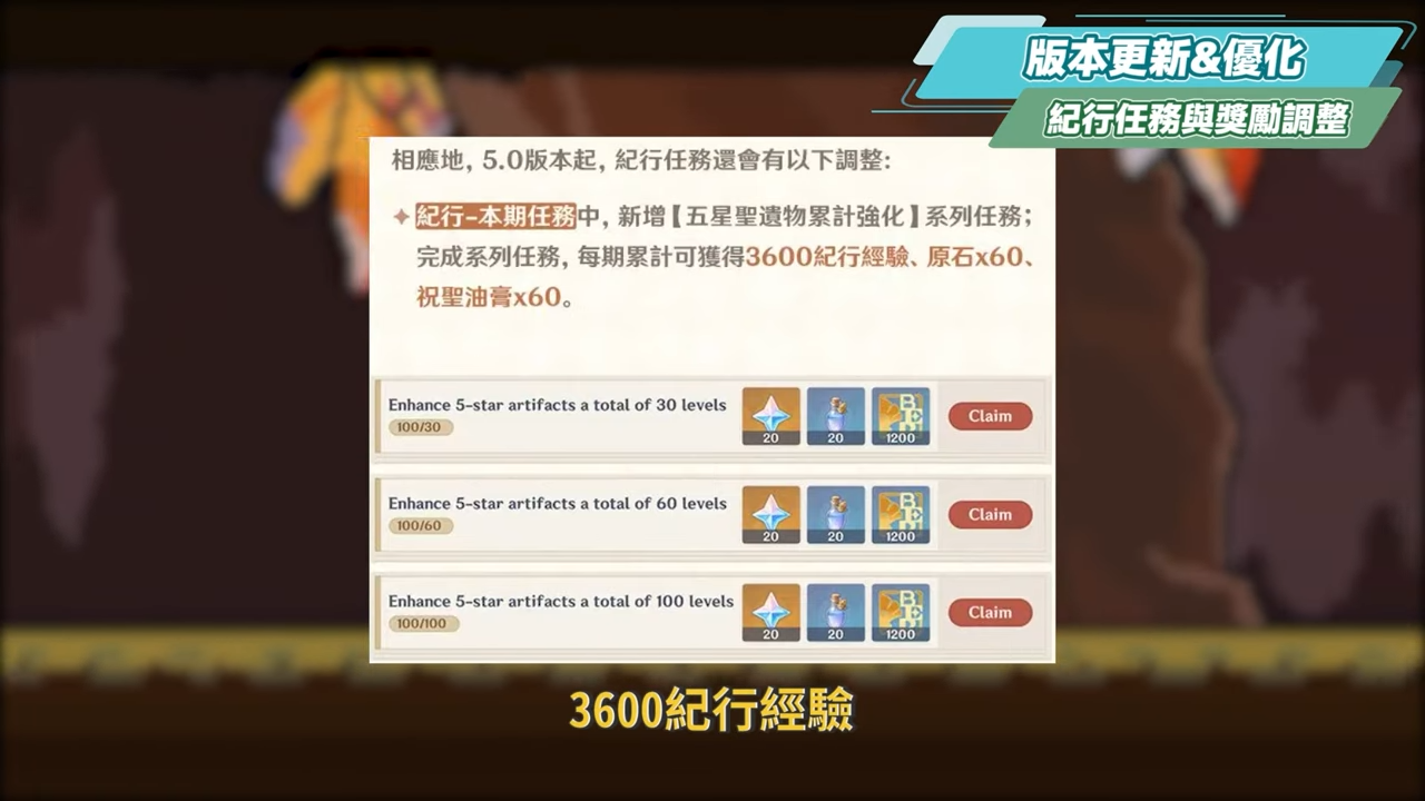 在紀行中的本期任務,會新增「五星聖遺物累計強化」任務,完成系列任務可以獲得3600紀行經驗、原石60與祝聖油膏60個。原本是只有摩拉,現在新增了原石獎勵。而在每日任務中,完成「領取4次委託獎勵」所獲得的紀行經驗會調高至200。