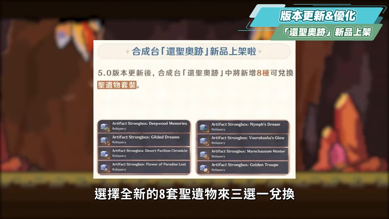 在5.0後,我們可以在合成台選擇全新的8套聖遺物來三選一兌換。大部分是以須彌地區的為主,不過洛洛竟然還發現,「逐影獵人」和「劇團」套也都被加進來了呢。