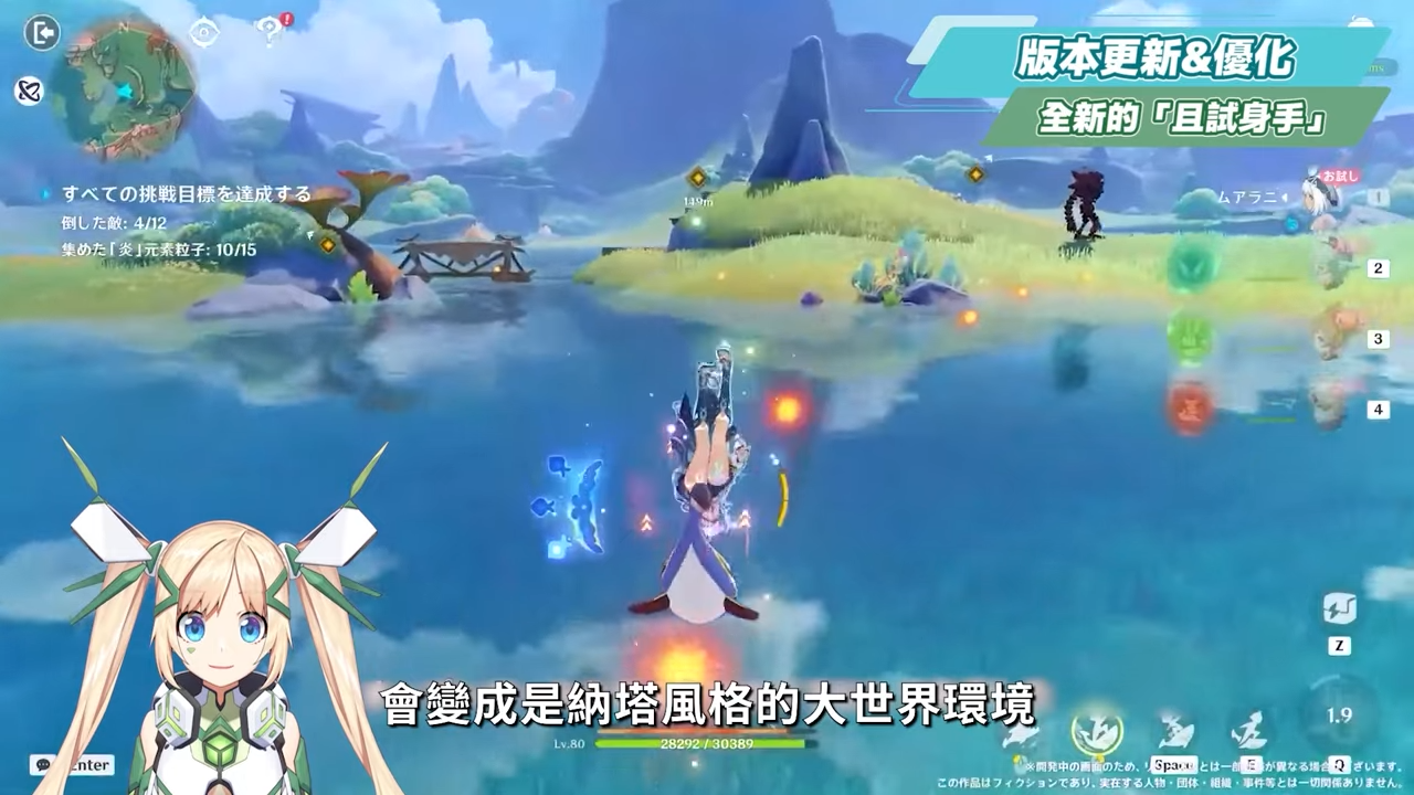 在5.0版本後,官方表示重製了一部份的「且試身手」場地,在畫面中可以看到納塔角色的試用關卡,會變成是納塔風格的大世界環境,這樣就可以更好得讓我們能夠去實測不同角色的各項能力,像是攀岩、衝浪等都可以直接體驗試用。