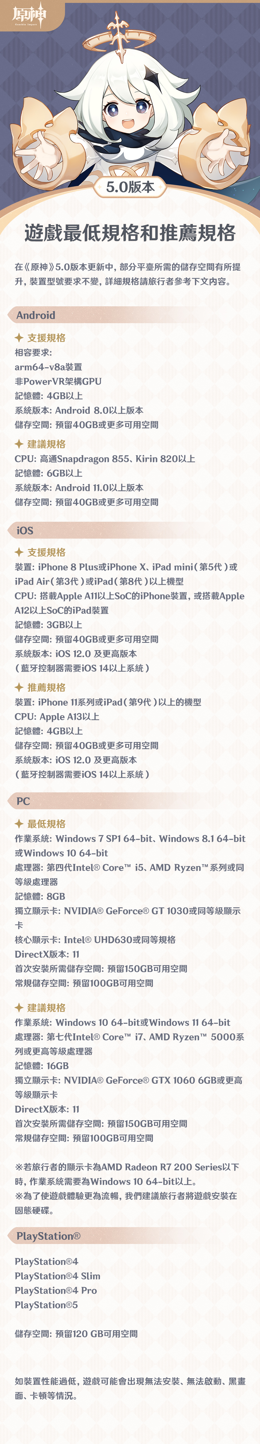 在5.0版本中,為了改善機械硬碟完成預先下載後的更新安裝速度,PC版預先下載所需空間較大,約為26-38GB(其中遊戲檔案所佔容量為16-23GB)。