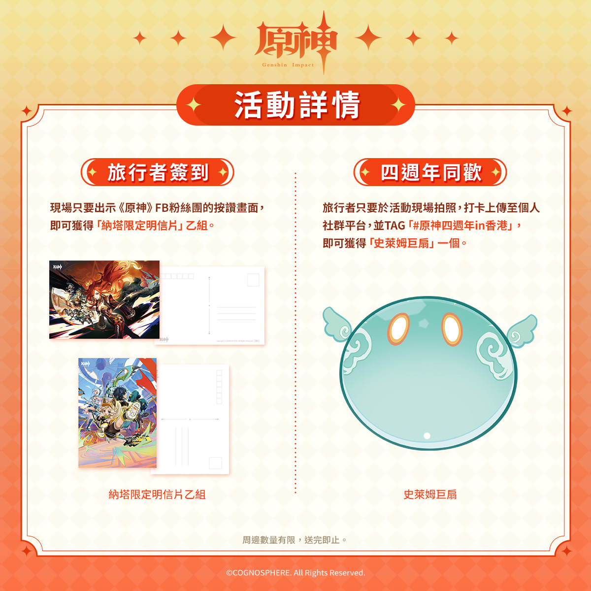 四週年同歡:旅行者只要於活動現場拍照,打卡上傳至個人社群平台,並TAG「#原神四週年in香港」,即可獲得「史萊姆巨扇」一把。