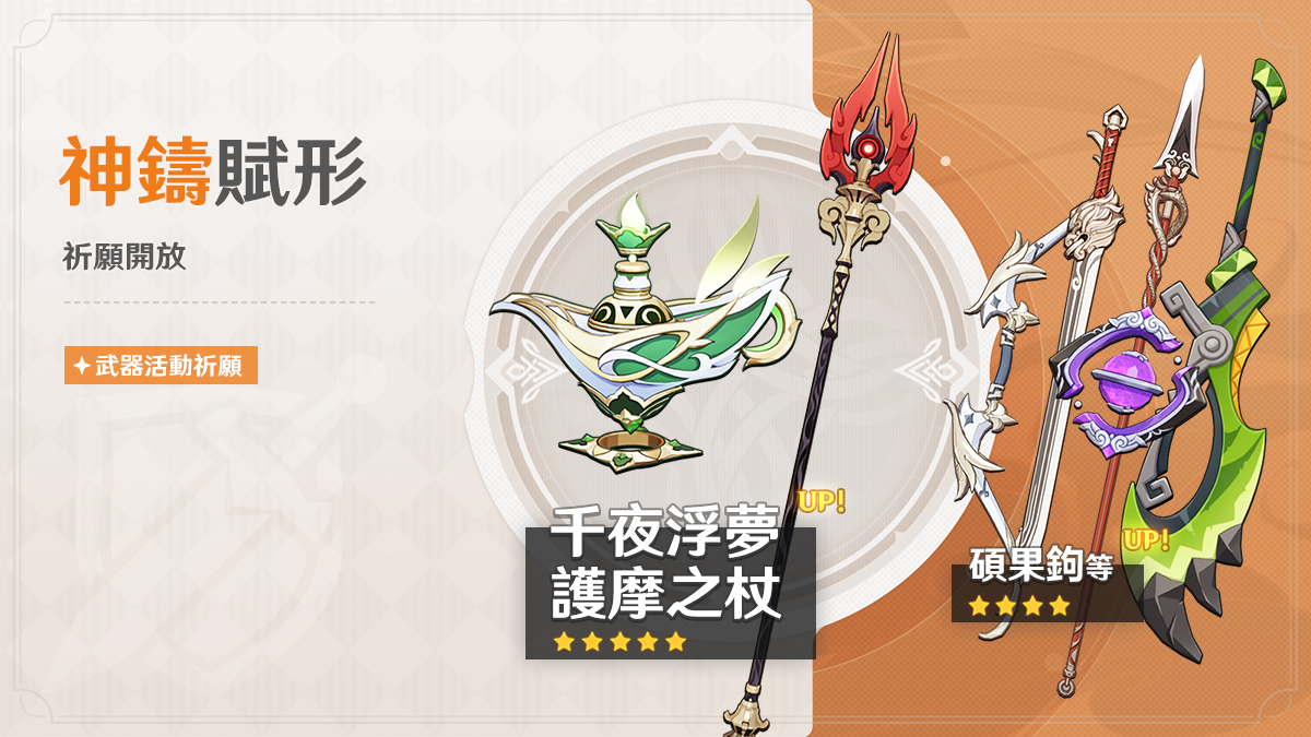 「神鑄賦形」祈願:「法器·千夜浮夢」、「長柄武器·護摩之杖」機率UP!