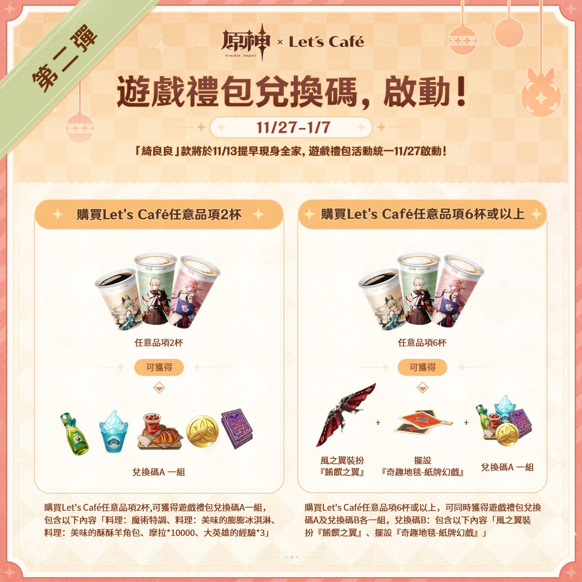11/27起,至全台全家店舖現場購買「Let’s Café」任意品項2杯,即可獲得遊戲禮包兌換碼A一組;現場購買「Let’s Café」任意品項6杯或以上,可同時獲得遊戲禮包兌換碼A及兌換碼B各一組。
