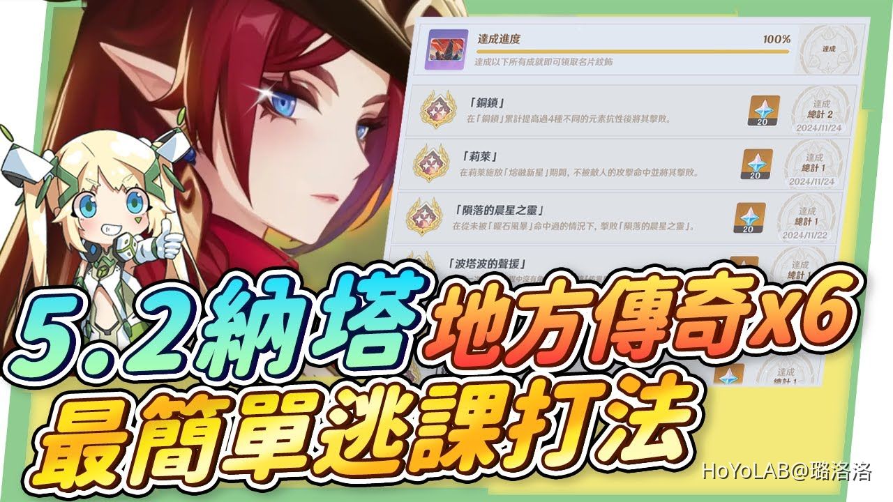 這次要帶來的是《原神》5.2納塔地區新增的6處地方傳奇,和5.0版本的一樣,每個地方傳奇都會有3個階段的成就可以拿,其中2個野外的地方傳奇可以透過多人聯機或是抱大腿輕鬆合作完成,更甚至可以到一些世界等級較低的萌新或素材號世界裡面來降低難度,但有一些地方傳奇是要進入納塔特有的「夜魂試煉」,稍後洛洛也會帶來相關的逃課方式與打法攻略~若是逃不過的或是想要抱大腿的,也歡迎在每周日晚上直播時來找洛洛帶你快速討伐野外地方傳奇,那麼事不宜遲,就讓我們開始吧!