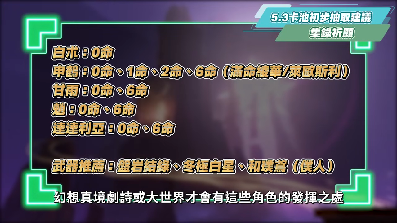 而對於平民玩家又比較需要考慮強度的話,洛洛認為是除了申鶴可以拿一隻0命預防後面有其他冰C會用到之外,其實要跳過都是可以跳過的,剩下就是課長的部分,若有自己比較喜歡的角色想補滿命,像是申鶴的滿命給滿命綾華或萊歐斯利使用,甘雨6命洛洛自己也是用了很久,到現在還是蠻喜歡的,或許有很多角色機制上都比甘雨要來得更好,但洛洛還是覺得滿命甘雨還是挺好用的,但比較偏舊體系,魈和達達利亞的6命也都比較偏真愛黨,以目前的情況來說,可能也比較屬於是幻想真境劇詩或大世界才會有這些角色的發揮之處。武器方面比較泛用的則會推薦盤岩結綠、冬極白星和和璞鳶,其他則可以根據自己主練的角色去決定是否抽取,大部分集錄祈願的角色都是有蠻多武器的選擇的。